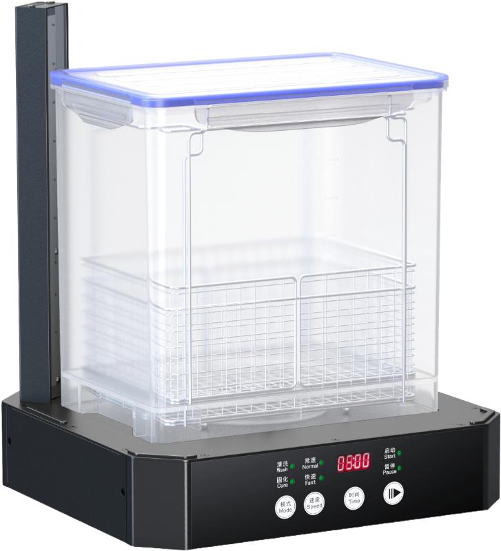 Для мойки моделей предусмотрен специальный контейнер, что обеспечивает возможность обработки крупных объектов. Как мойку, так и отверждение можно выполнять в этой корзине из нержавеющей стали.