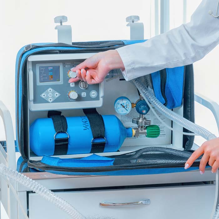 Портативный аппарат А-ИВЛ-Э-03 - высокотехнологичный прибор для поддержания дыхательных функций взрослых и детей в условиях медицины катастроф, автомобилей скорой медицинской помощи, полевых госпиталей, а также при внутрибольничной транспортировке.
