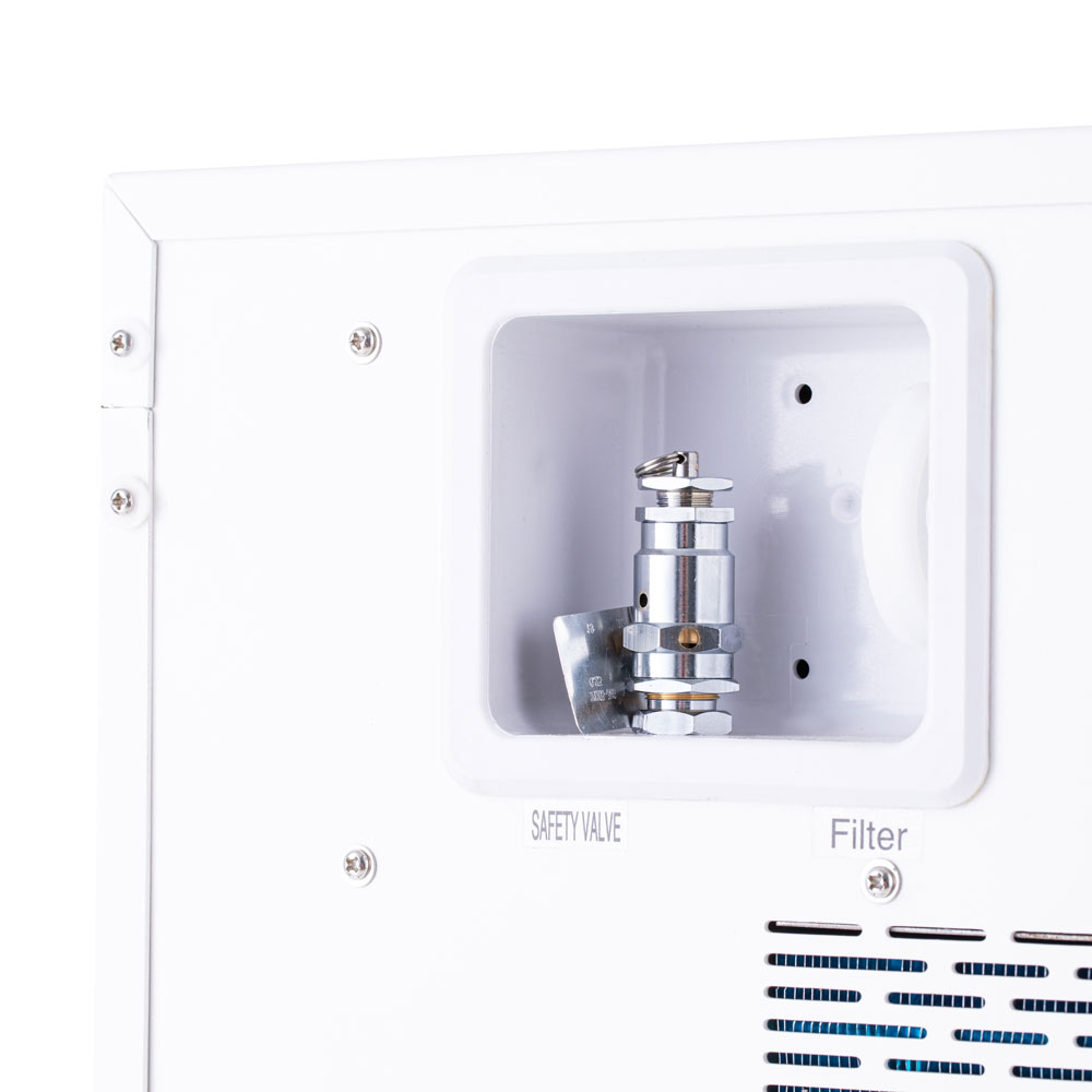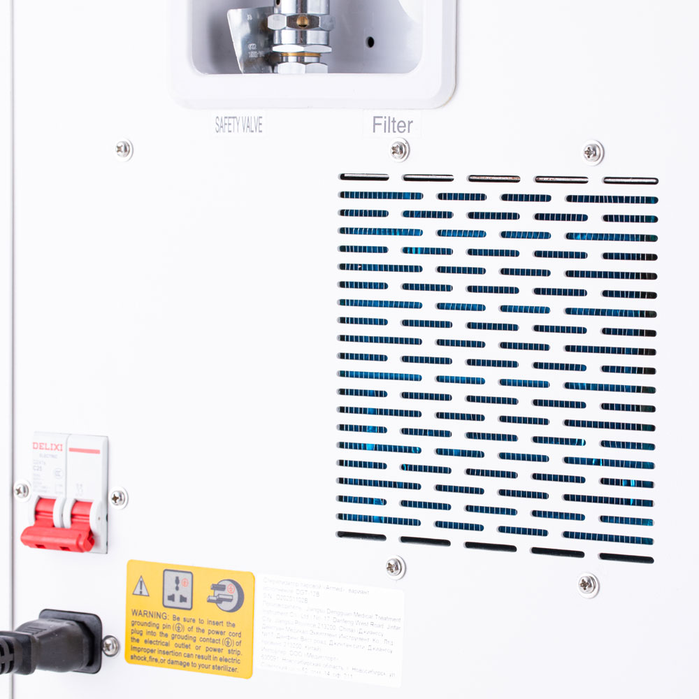 Для безопасности работы предусмотрена термозащита нагревательного элемента стерилизатора и предохранительный клапан на случай превышения допустимого давления в камере. После 15 минут бездействия происходит автоматическая блокировка дверцы, а при опустошении водяного бака и переполнении бака для отработанной воды раздаётся звуковой сигнал.