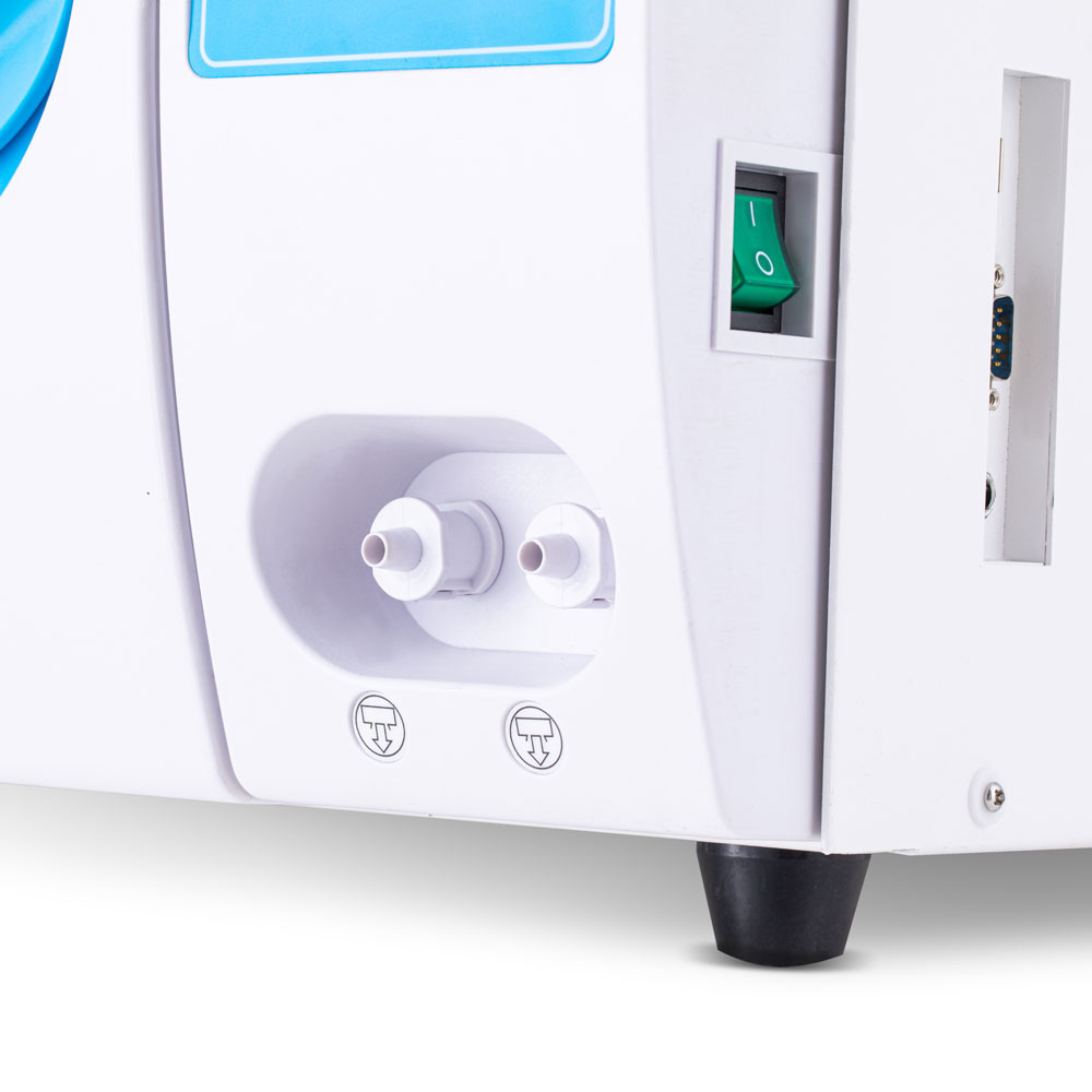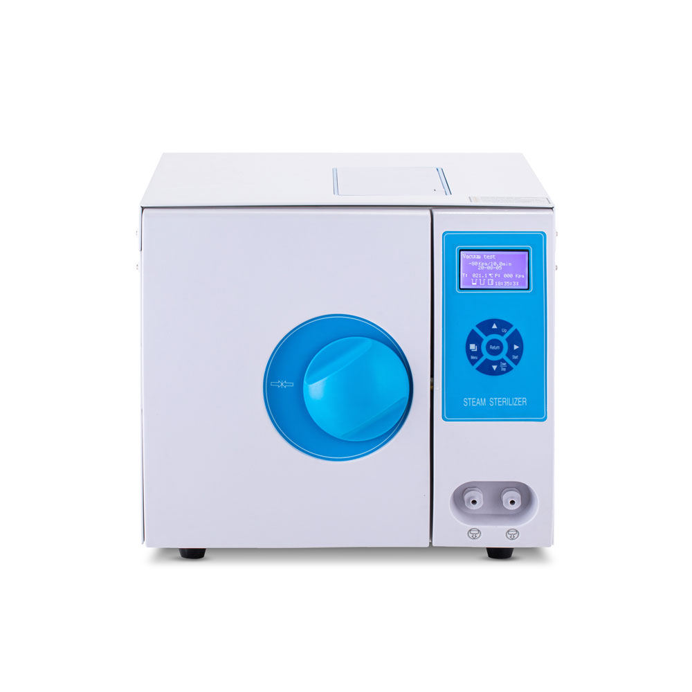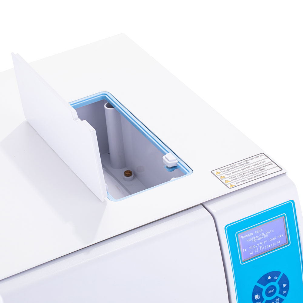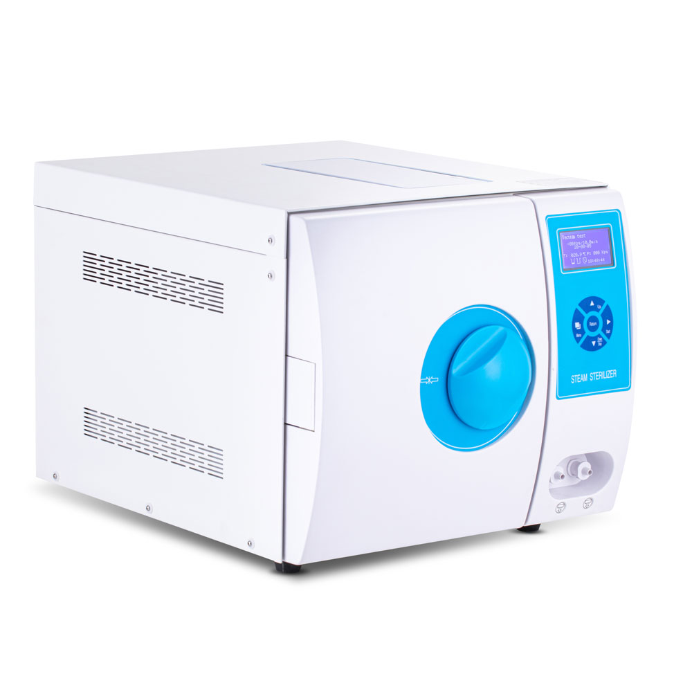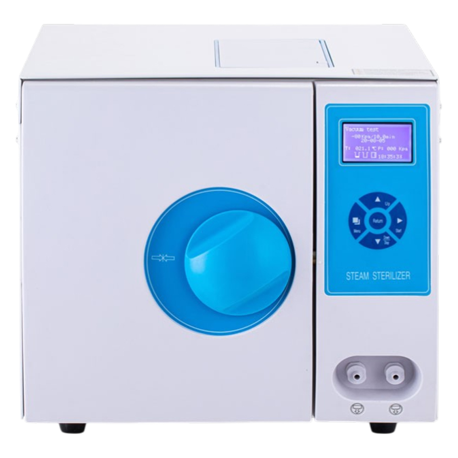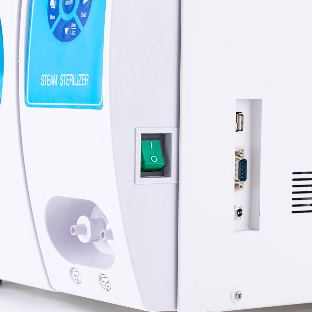 На лицевой панели расположены понятные кнопки управления и информативный ЖК-дисплей, на котором отображается дата, выбранная рабочая программа, температура в камере, время стерилизации, подключение термопринтера, количество чистой и отработанной воды, положение дверцы стерилизатора, а также температура и давление в помещении, где установлен прибор.