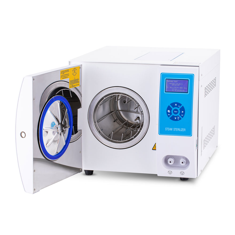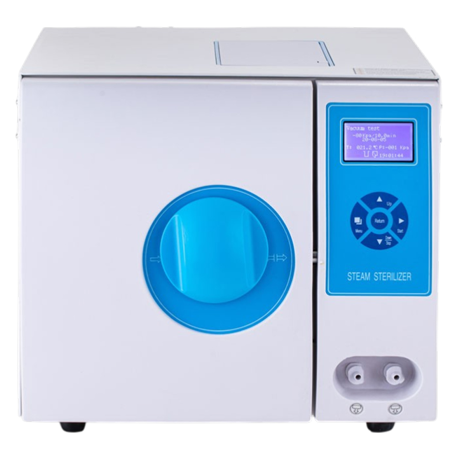 На лицевой панели расположены понятные кнопки управления и информативный ЖК-дисплей, на котором отображается дата, выбранная рабочая программа, температура в камере, время стерилизации, подключение термопринтера, количество чистой и отработанной воды, положение дверцы стерилизатора, а также температура и давление в помещении, где установлен прибор.