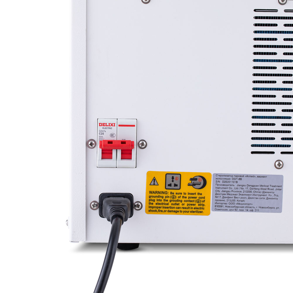 Паровой стерилизатор Армед DGT-8 B оснащён камерой из нержавеющей стали объёмом 8 литров, водяным баком на 2,5 литра и баком для отработанной воды. Рабочие программы предусматривают обработку изделий при температуре 121 или 134 °C продолжительностью от 4 до 30 минут.