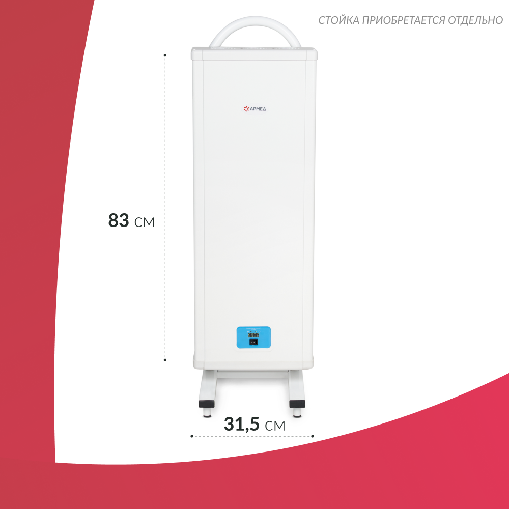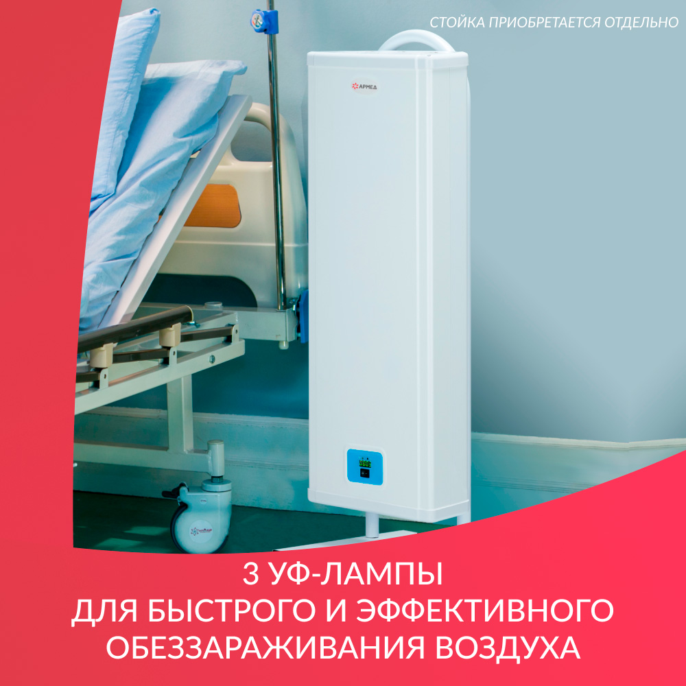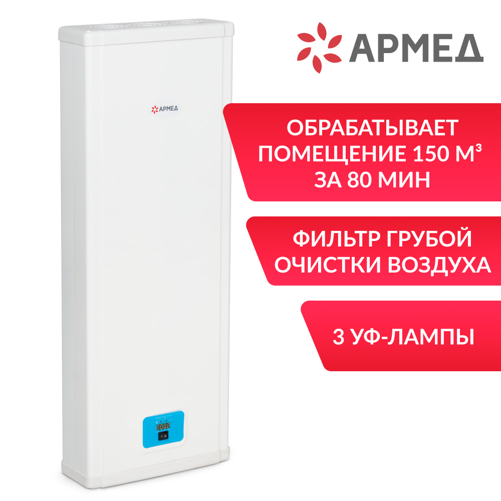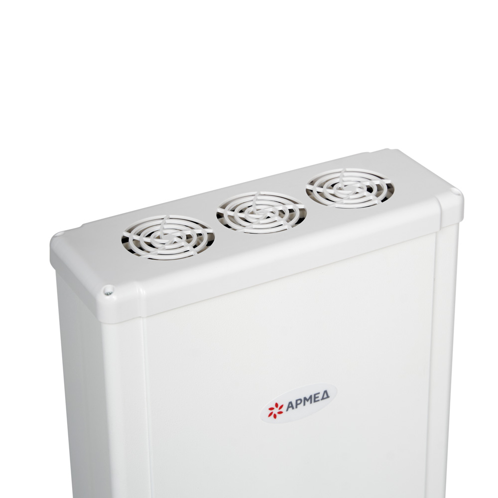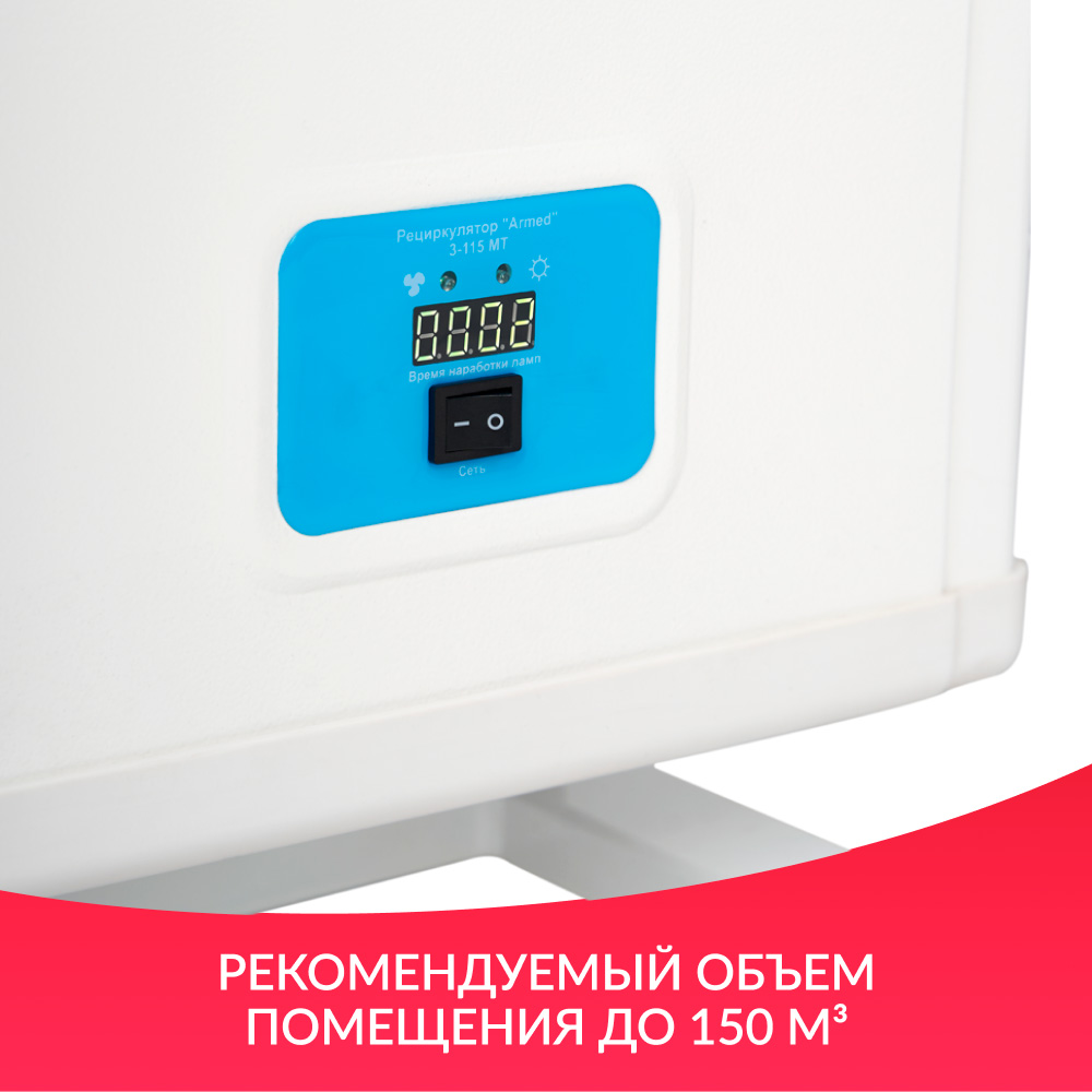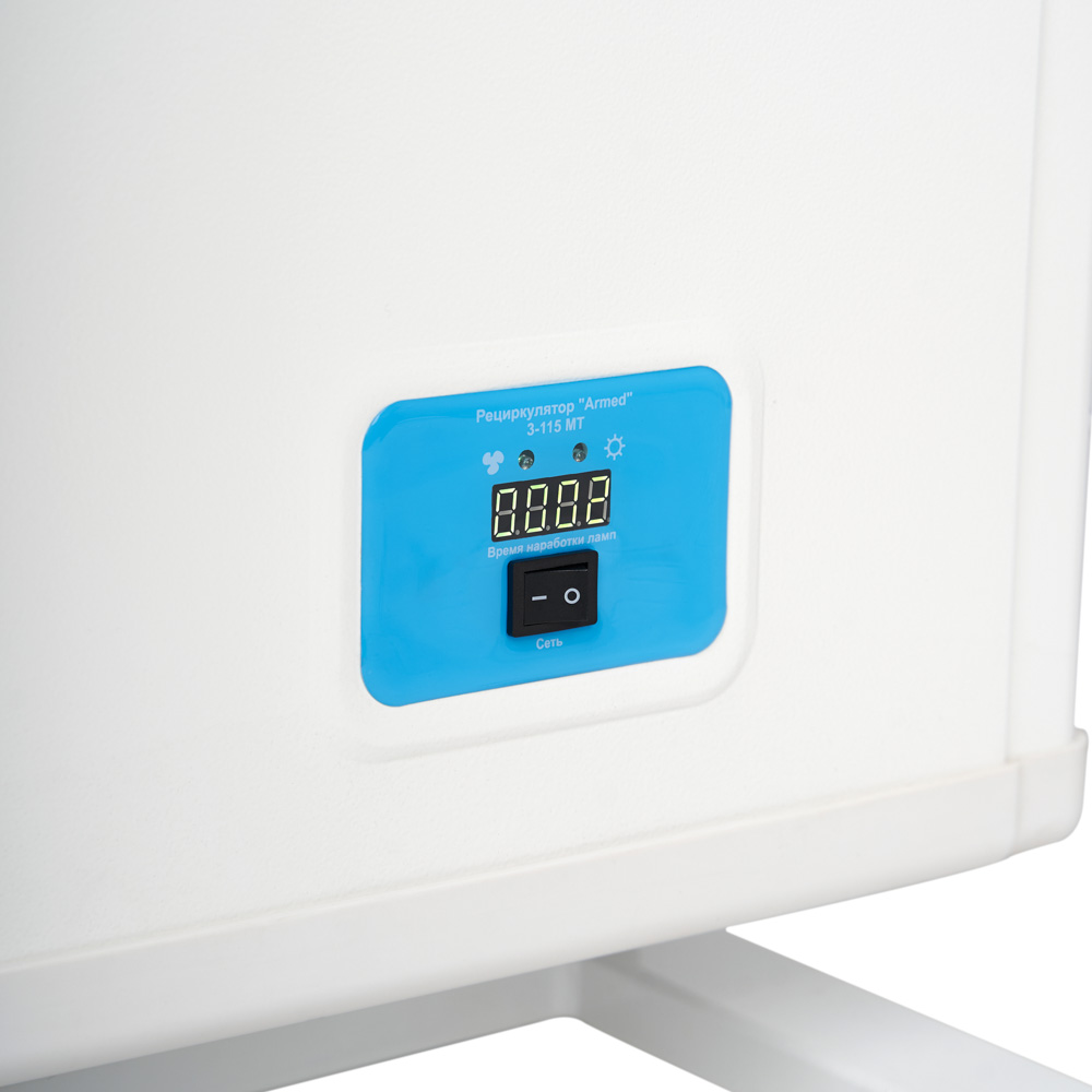 Рециркулятор Армед 3-115 МТ имеет три ультрафиолетовые лампы и разработан для обеззараживания крупных многолюдных помещений, например, в медцентрах – коридоры, операционные, хирургические, перевязочные кабинеты, родильные отделения. Прочный металлический корпус защищает УФ-лампы.