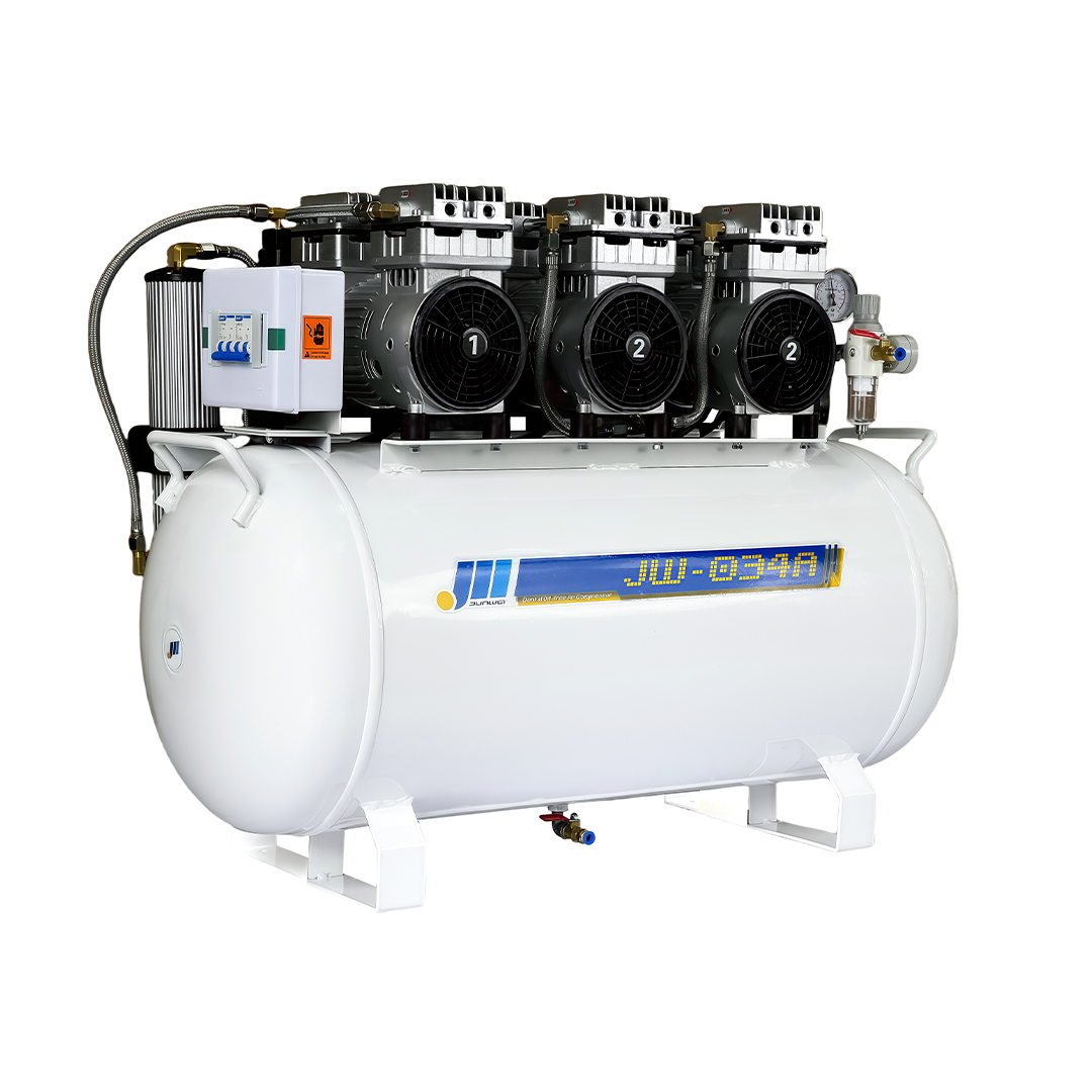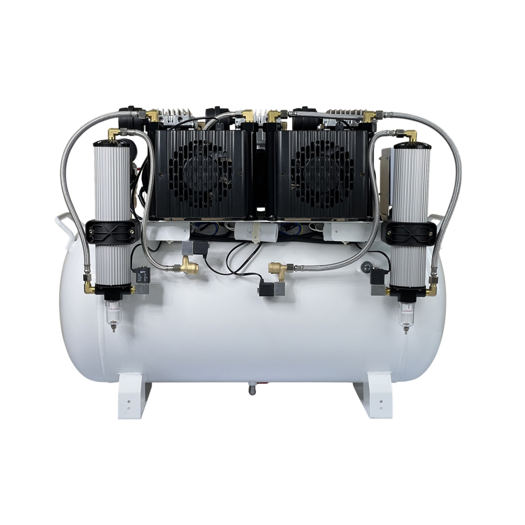 Безмасляный стоматологический компрессор для 4-5 стоматологических установок с осушителем, ресивером на 90 л и производительностью 256 л/мин.