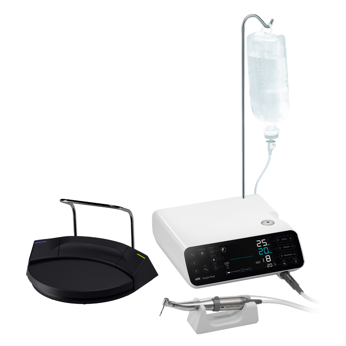 Surgic Pro2 OPT – физиодиспенсер в комплекте с микромотором SGL80M и наконечником Ti-Max X-SG20L с подсветкой. Обновленная модель классического физиодиспенсера отличается высокой надежностью и безопасностью, повышенным удобством использования и легкой интеграцией с другими устройствами NSK.