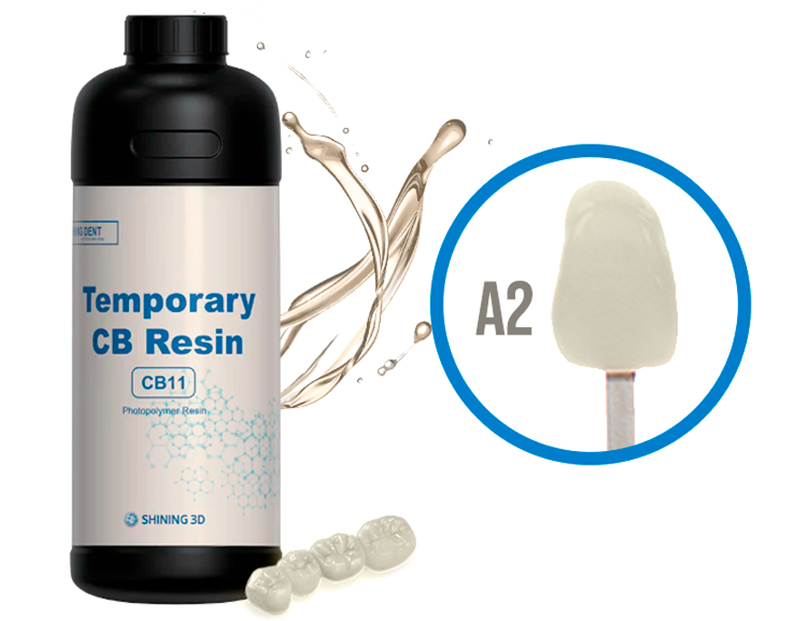 Temporary CB (CB11) - это окрашенная в цвет зубов смола для 3D-печати временных коронок и мостовидных протезов, вкладок, накладок и виниров. Из этого материала с высоким содержанием наполнителя можно изготовить мостовидные протезы, протяженностью до семи компонентов. У производителя доступны 4 оттенка VITA, данный полимер цвета A2.