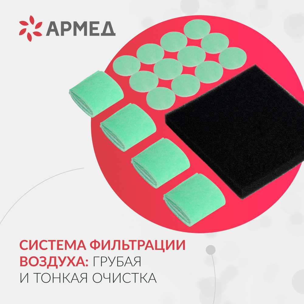 В задней части корпуса расположен фильтр грубой очистки, препятствующий попаданию внутрь частиц пыли. Внутри прибора есть фильтры тонкой очистки, задерживающие более мелкие посторонние частицы. Кроме того, предусмотрена система охлаждения, предотвращающая перегрев компрессора при длительной непрерывной работе.