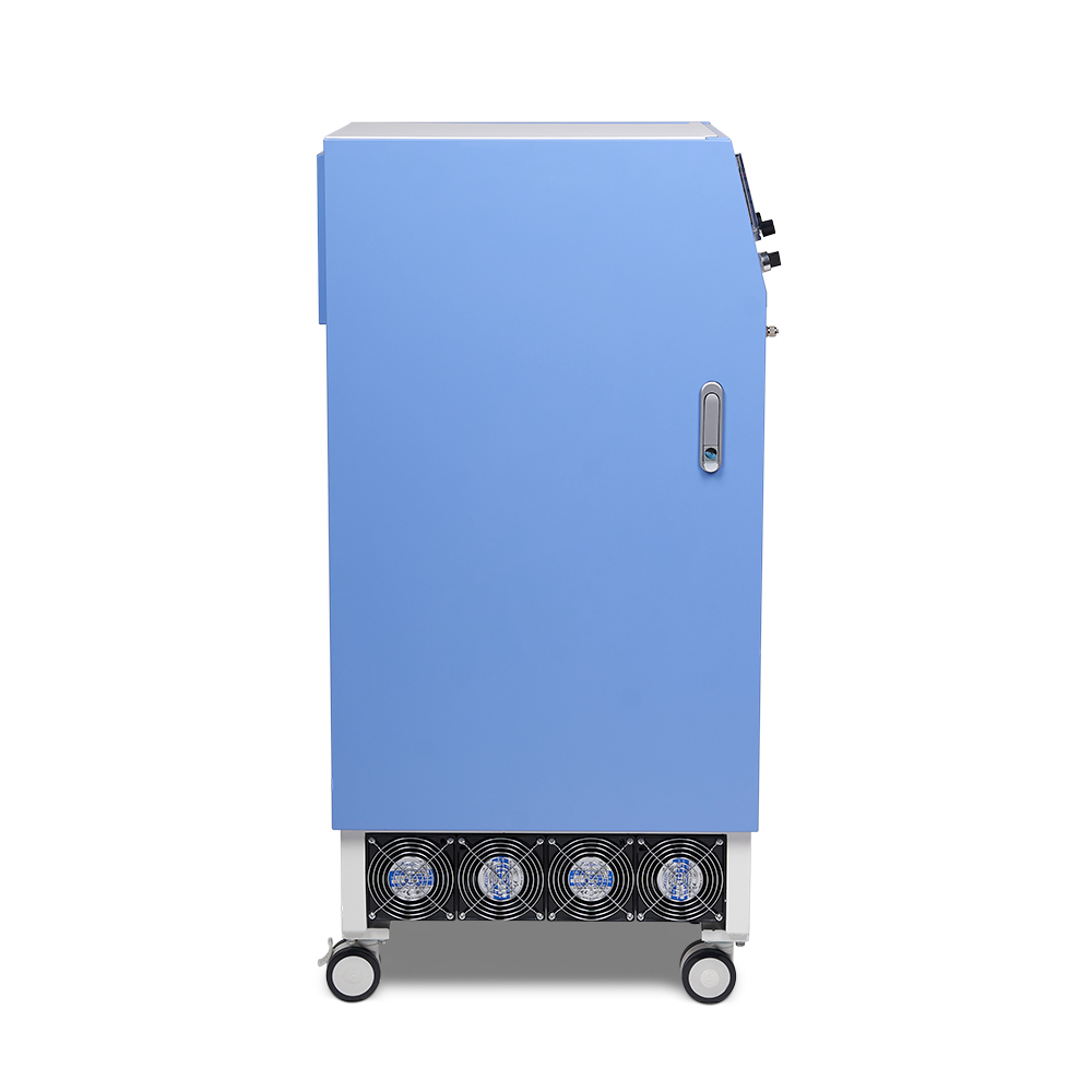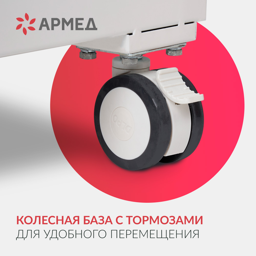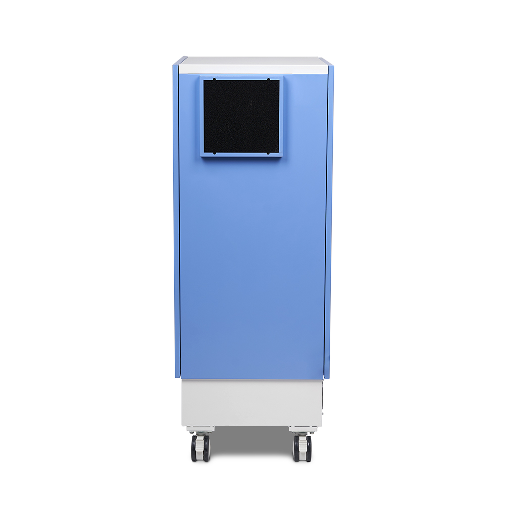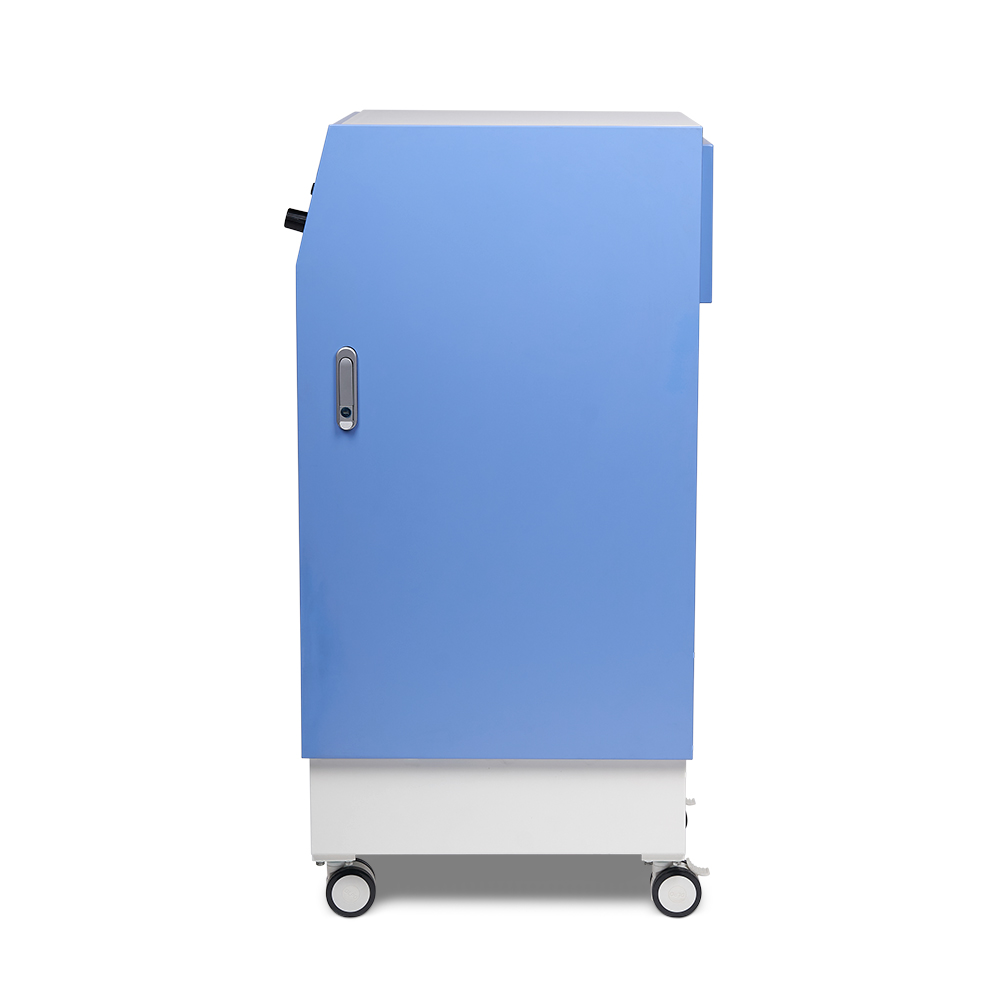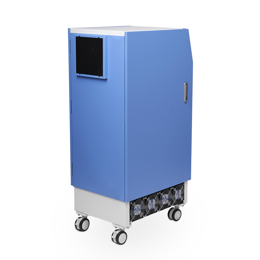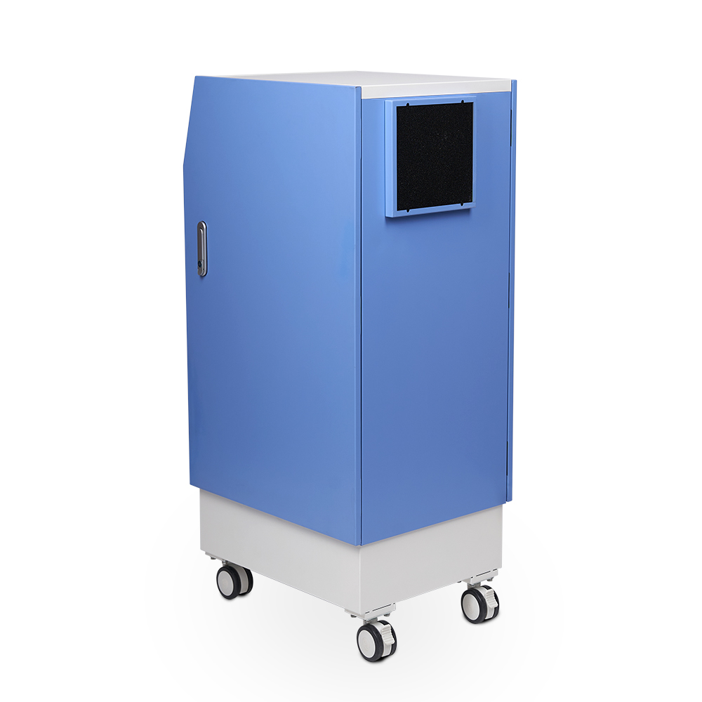 Прочный корпус прибора изготовлен из металла с порошковым напылением. Для удобства перемещения он оснащён манёвренными колёсами с фиксаторами. Боковые дверцы корпуса открываются для быстрого доступа к внутренней части устройства при необходимости обслуживания и ремонта.