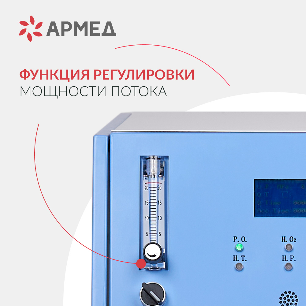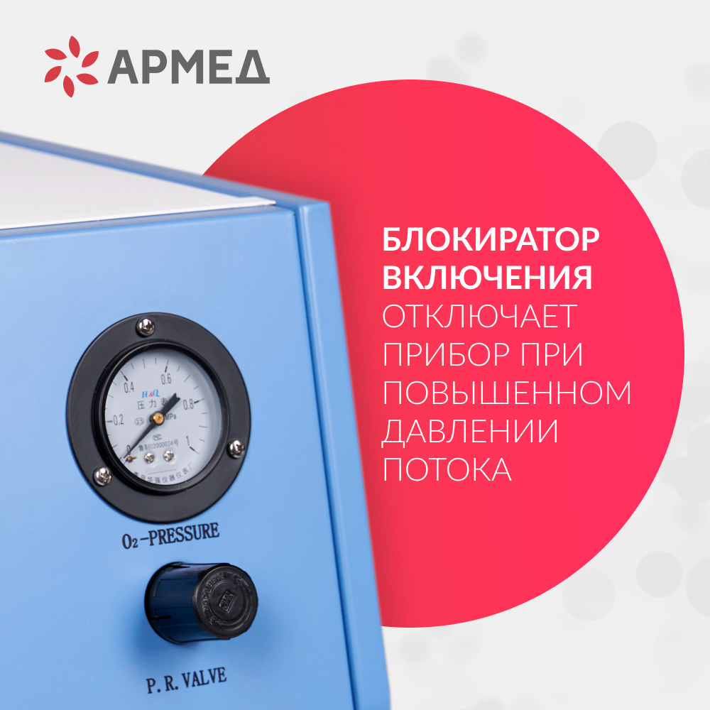 Максимальная скорость потока составляет 10 литров кислородно-воздушной смеси в минуту. Механический регулятор позволяет настраивать поток плавно и точно. Визуально контролировать скорость позволяет расходомер на лицевой панели прибора.