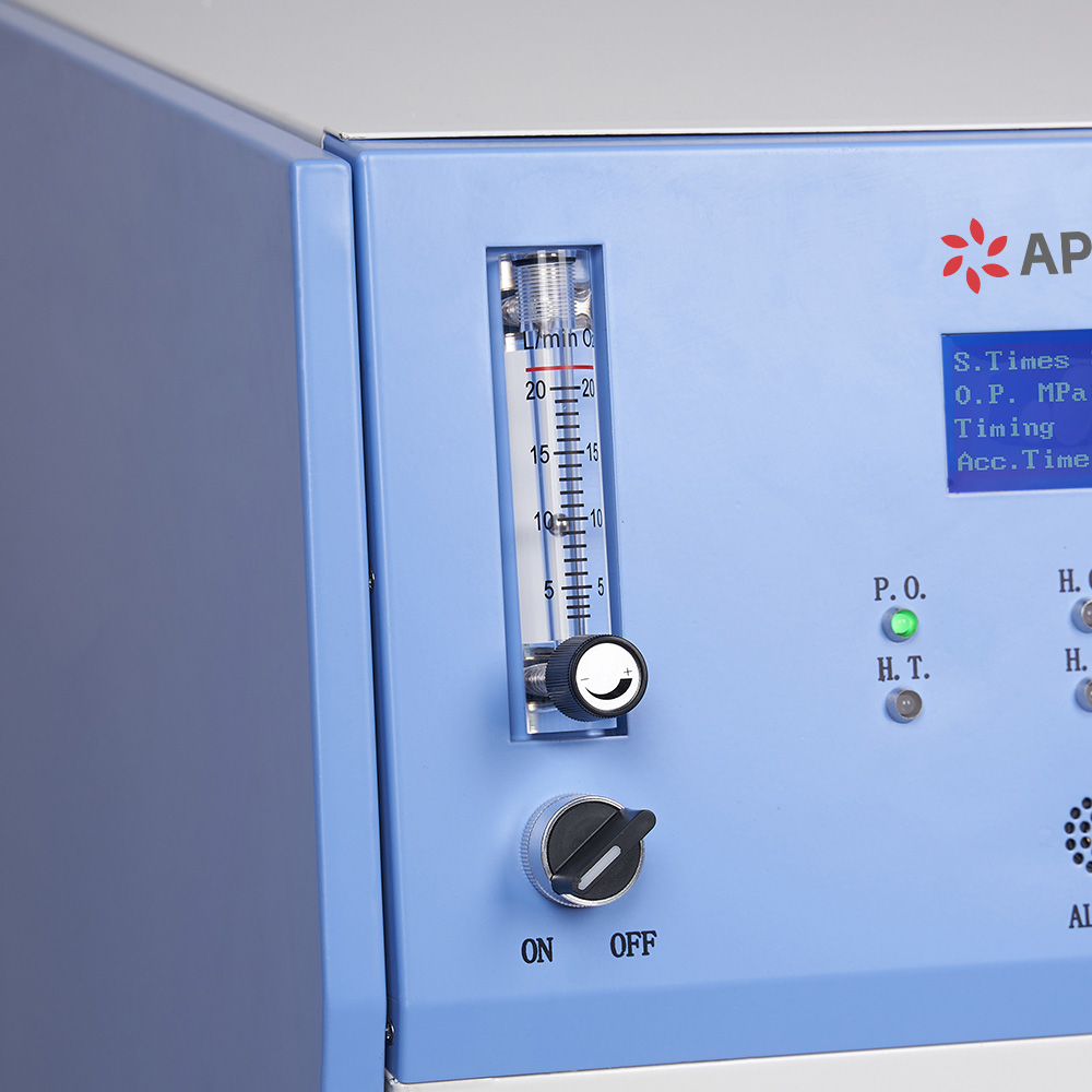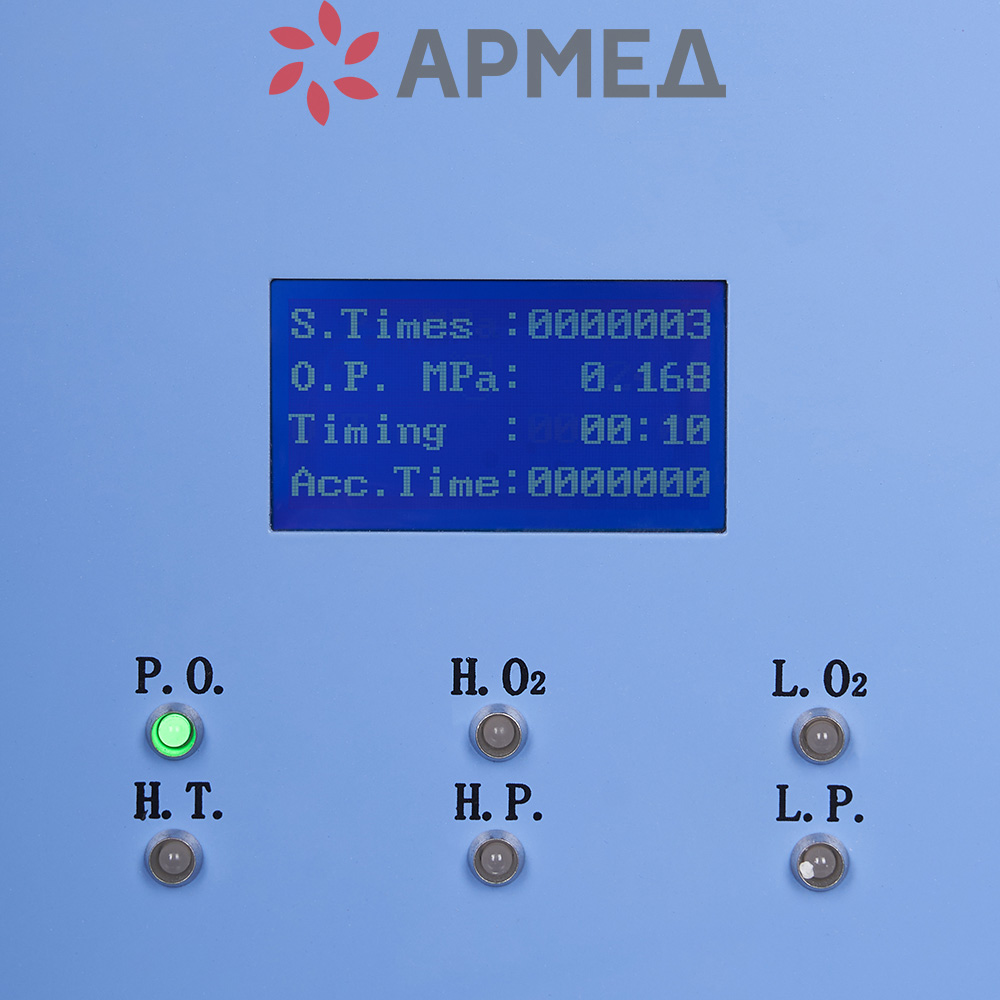 На панели управления, помимо расходомера и регулятора потока, расположена кнопка питания и информативный дисплей. На дисплее отображается уровень давления кислородно-воздушной смеси, температура корпуса, время работы с момента включения и общее отработанное время.