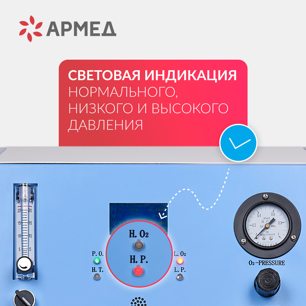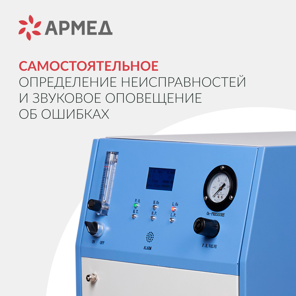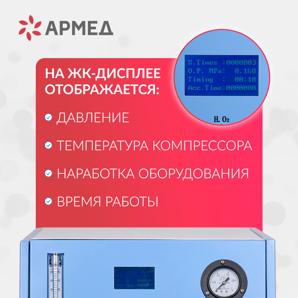 Прибор обладает всеми необходимыми для бесперебойной работы функциями: подсчёт и отображение отработанного времени, самостоятельное обнаружение неисправностей, связанных с давлением, системным циклом, компрессором, уровнем концентрации кислорода.