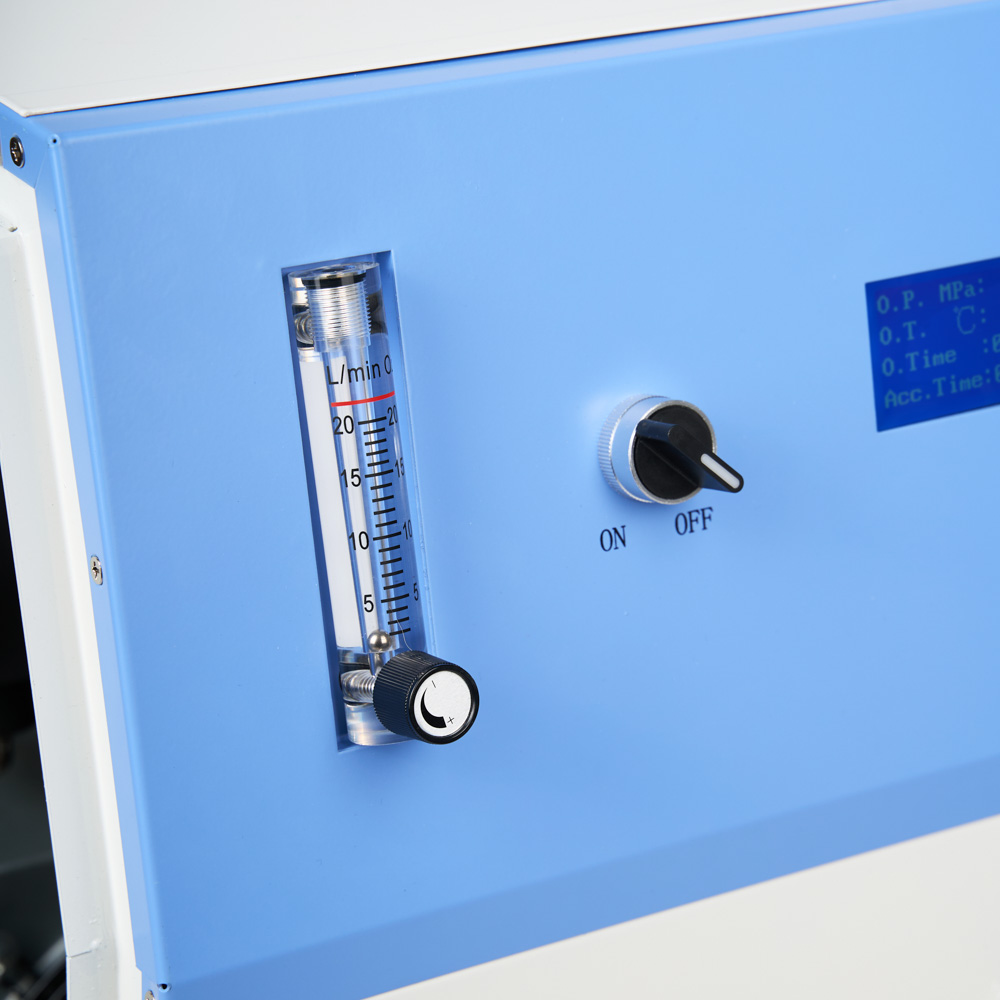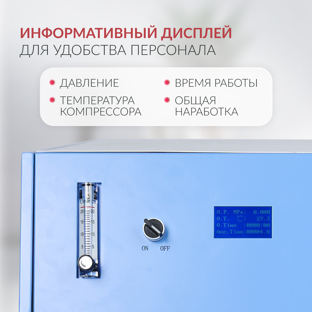 На панели управления, помимо расходомера и регулятора потока, расположена кнопка питания и информативный дисплей, отображающий уровень давления кислородно-воздушной смеси, температуру компрессорной камеры, время работы с момента включения и общее отработанное время.