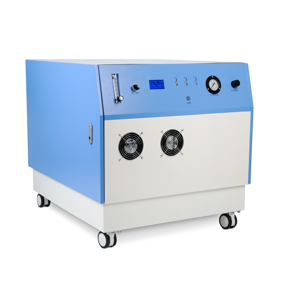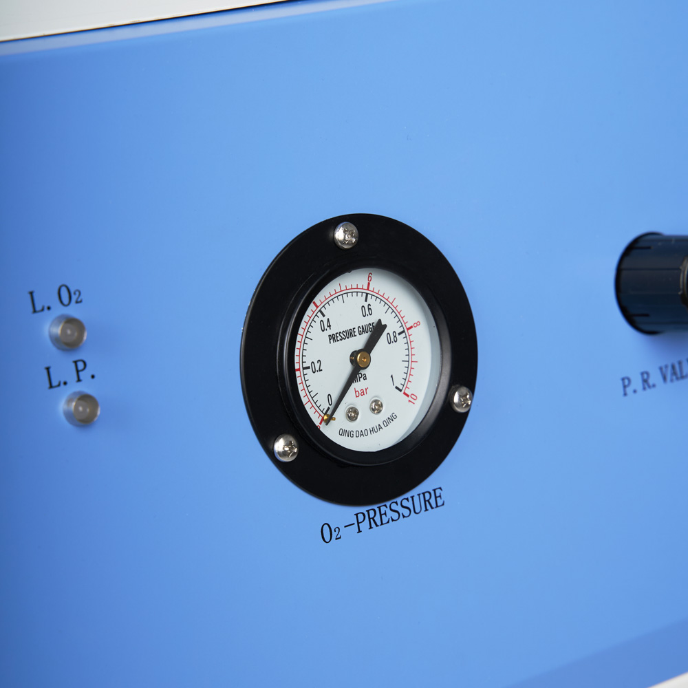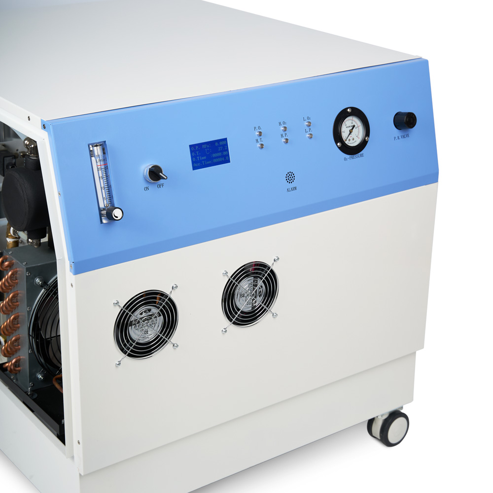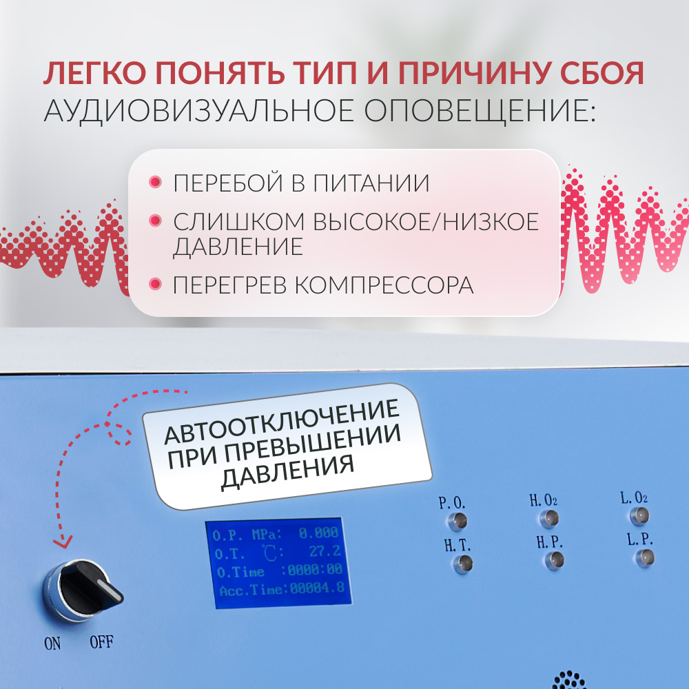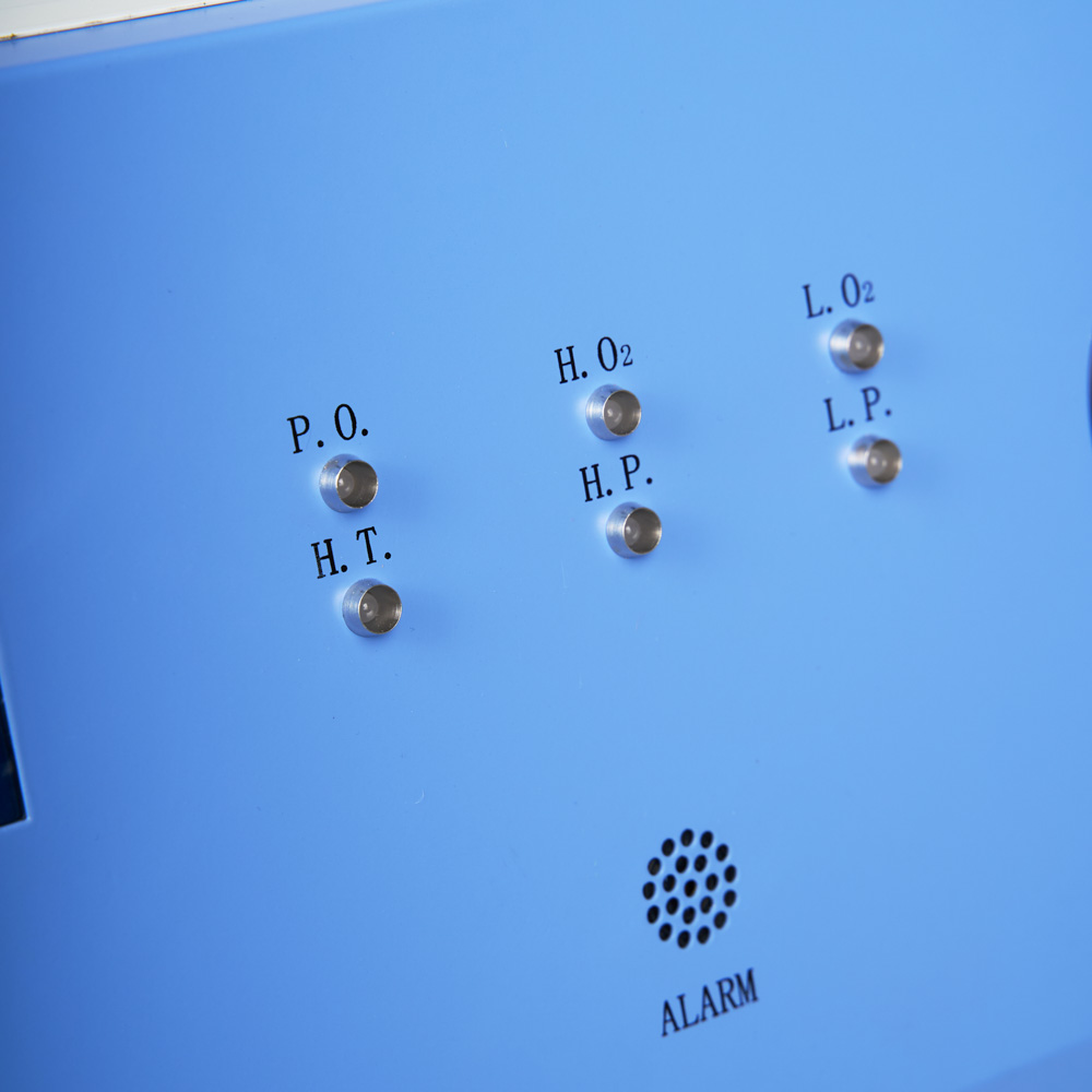 Для удобства персонала рядом с дисплеем расположено 6 световых индикаторов, обозначающих состояние питания, температуру компрессора, давление и концентрацию кислорода. По ним легко определить тип и причину неполадки и устранить её. Ниже находится выход для звукового оповещения о сбое. При превышении допустимого давления срабатывает автоматический выключатель питания.