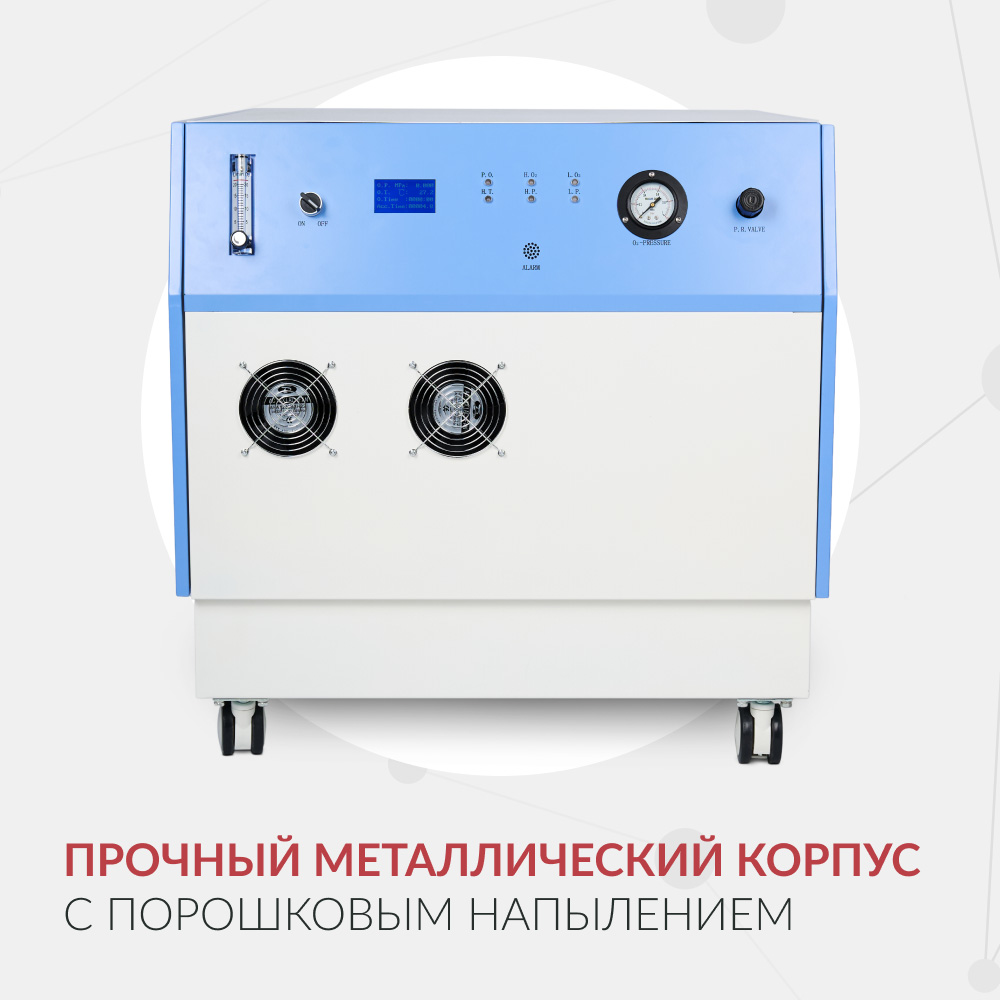 Несмотря на серьёзный функционал и очень высокую производительность, при необходимости концентратор кислорода достаточно легко переместить в другое помещение. Его прочный корпус изготовлен из металла с порошковым напылением и оснащён манёвренными колёсами с фиксаторами.