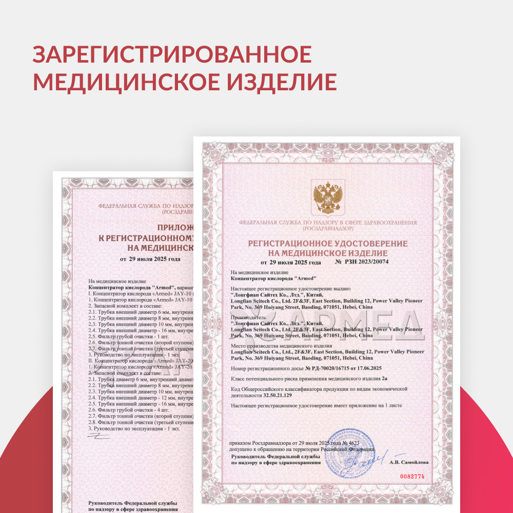 Концентратор кислорода является зарегистрированным медицинским изделием. Его безопасность и качество подтверждены удостоверением Росздравнадзора.