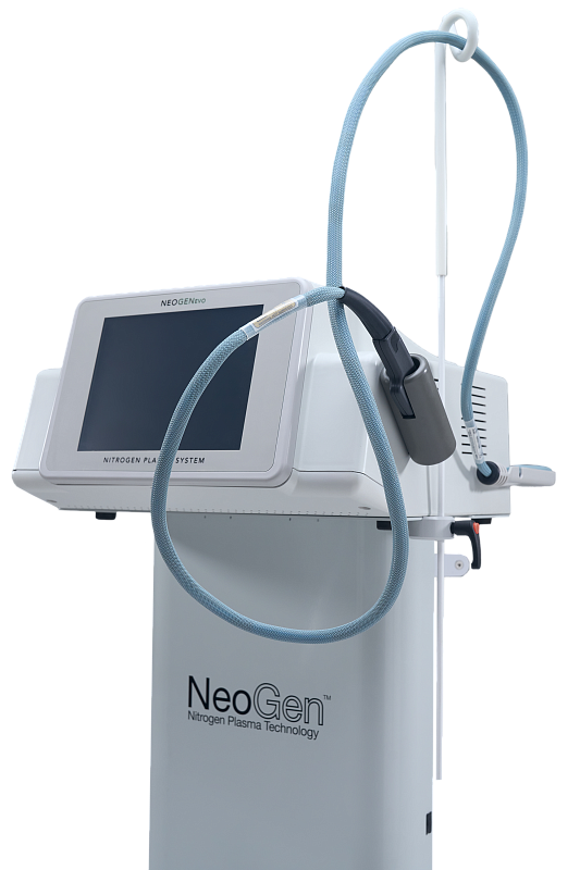 Применение аппарата NeoGen представляет из себя направленное воздействие на кожу потоком ионизированного азота. При взаимодействии с кислородом ионизированное состояние молекул азота дает им возможность быстро входить в реакцию образования монооксида азота (NO). Синтез оксида азота идентифицирован во многих клеточных структурах: нервной ткани, клетках эндотелия сосудов и конечно же, клетках кожи. Экзогенное воздействие газообразным оксидом азота способствует развитию противовоспалительных реакций, обновлению иммунного клеточного пула, расширению подкожных сосудов и перекисно-опосредованному бактерицидному эффекту.