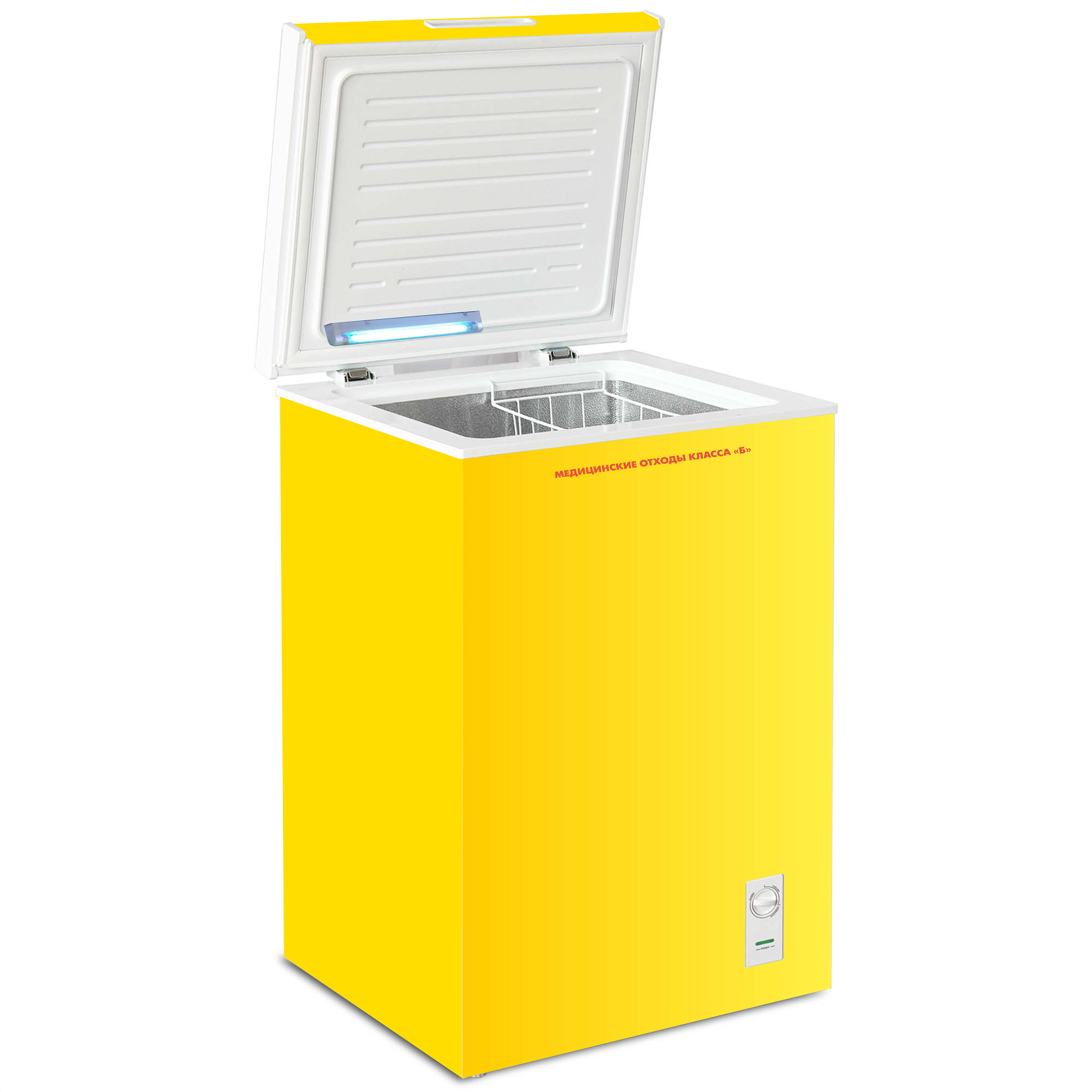 Морозильник для временного хранения медицинских отходов класса Б GTS F-100: объём морозильной камеры 100 л, температура в камере не выше -18°С. Морозильник оснащён УФ лампой, замком, баками для медицинских отходов: 1 бак 10 л и 1 бак 20 л.
