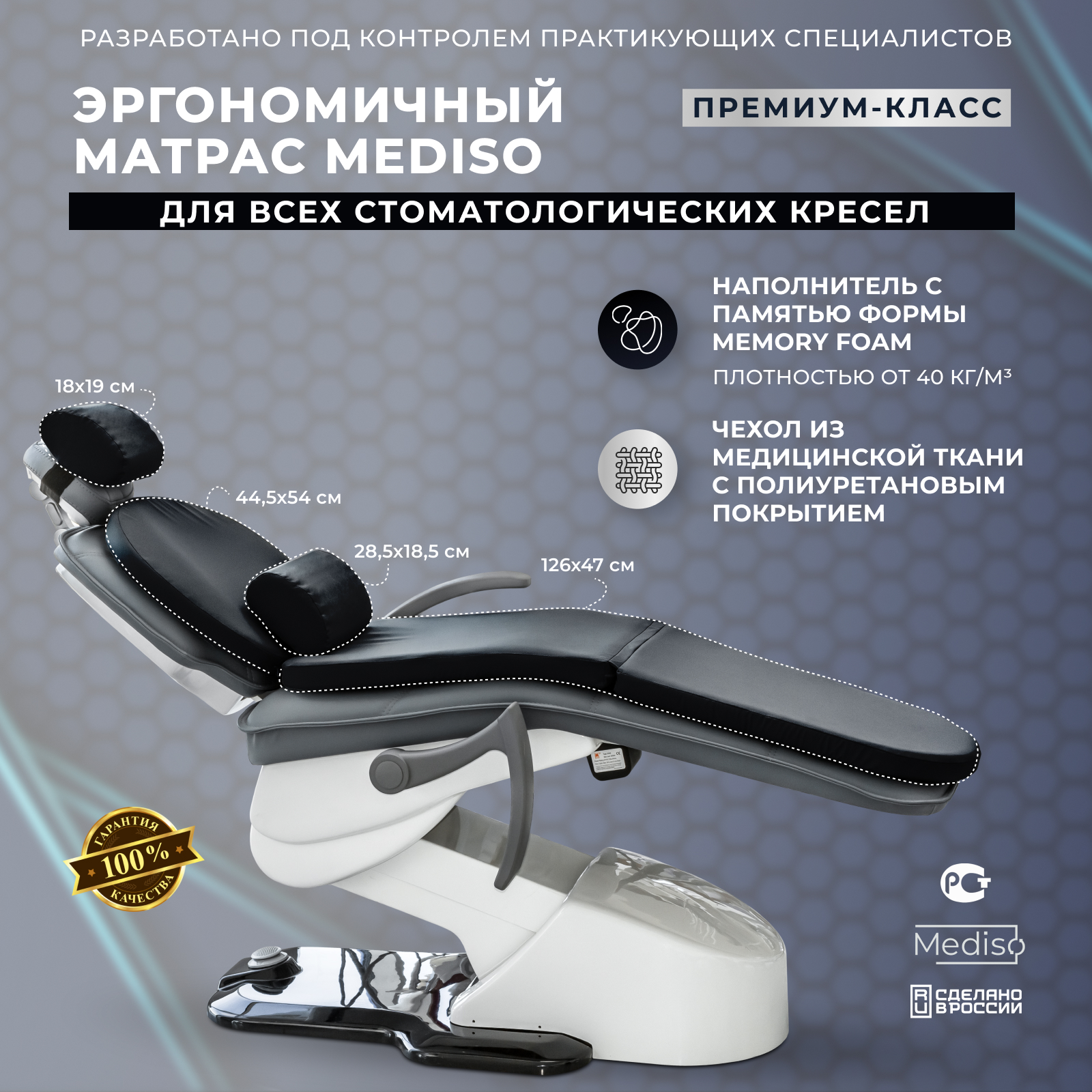 Ортопедический матрас MEDISO обеспечивает пациенту повышенный комфорт во время проведения длительных стоматологических манипуляций, а также, используется с эстетической целью.