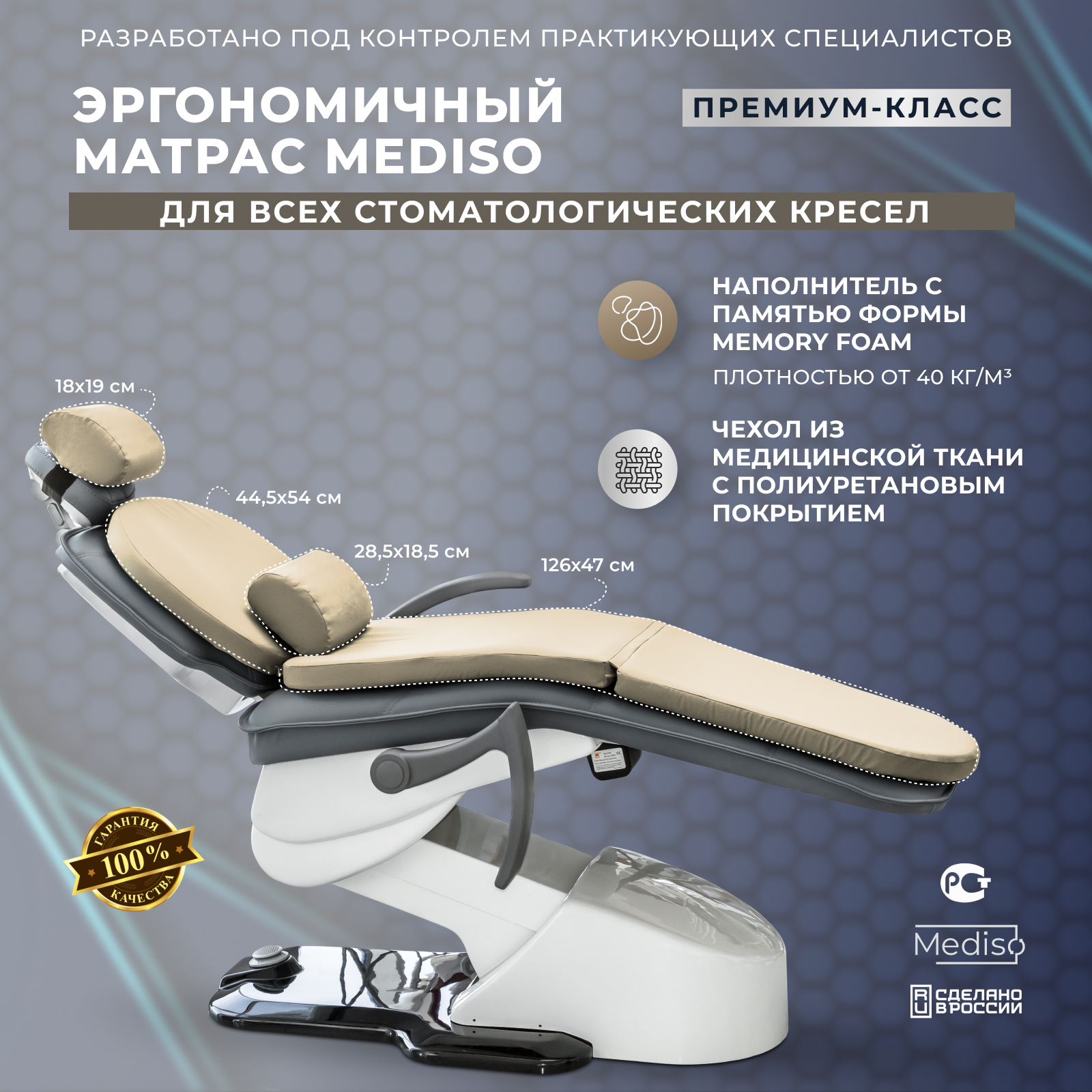 Ортопедический матрас MEDISO обеспечивает пациенту повышенный комфорт во время проведения длительных стоматологических манипуляций, а также, используется с эстетической целью.