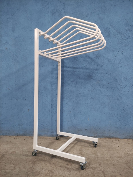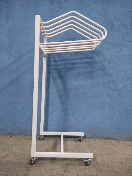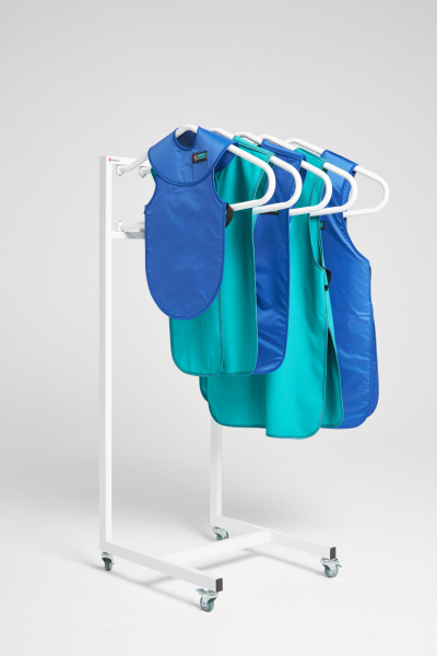Вешалка для рентгенозащитных фартуков, металлическая, передвижная. При необходимости зафиксировать на одном месте снабжена специальными стопорами на колесах. Порошковая окраска белого или серого цвета для износостойкости.