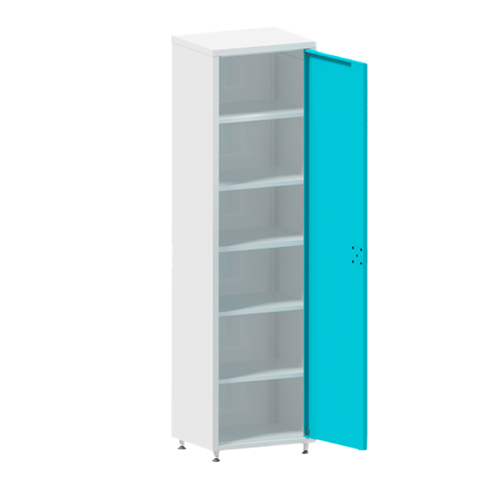 Изготовлен из металла толщиной не менее 0,8 мм. Окрашен порошковой краской белого цвета. 1 дверца из металла с ригельным замком. 5 металлических полок. Дверцу можно установить, как на левую сторону, так и на правую, путем перестановки втулок для петель. Установлен на регулируемые по высоте опоры.