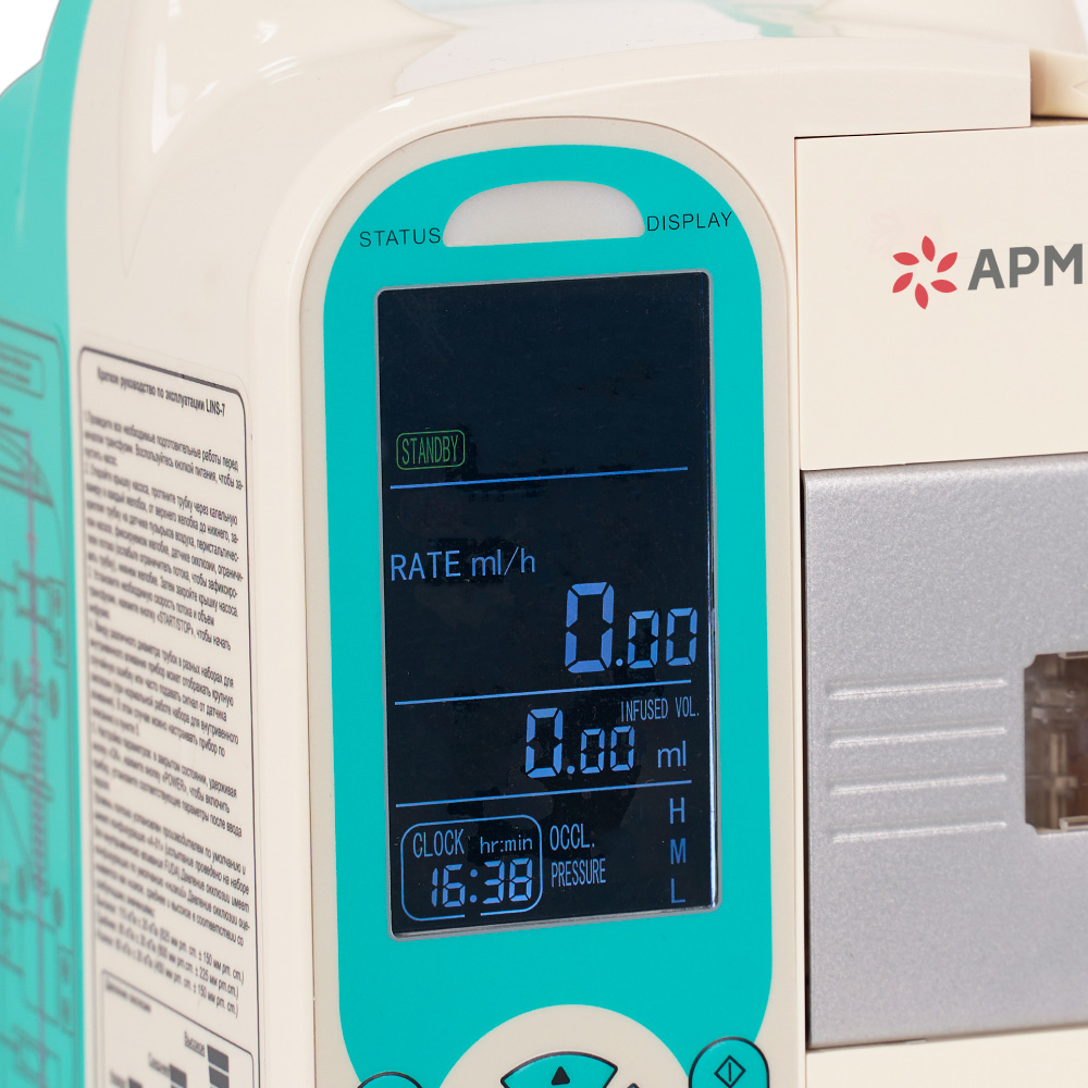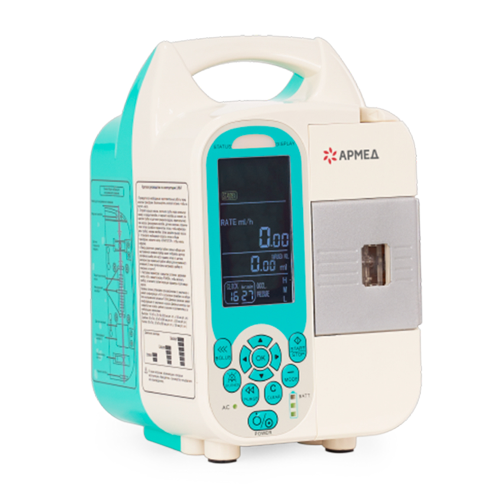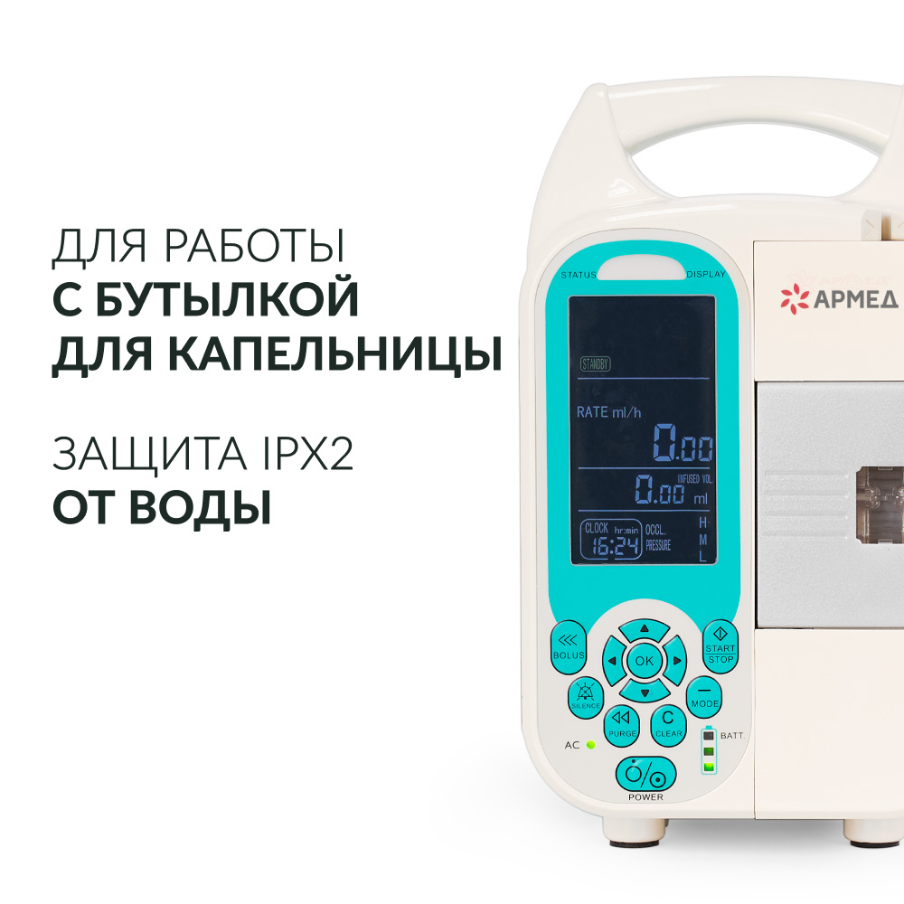На экране отображаются основные параметры настройки: скорость и объем вливания, время процедуры, заряд аккумулятора, подключение к электросети, системные ошибки и прочее. Показатели облегчают контроль за оборудованием.