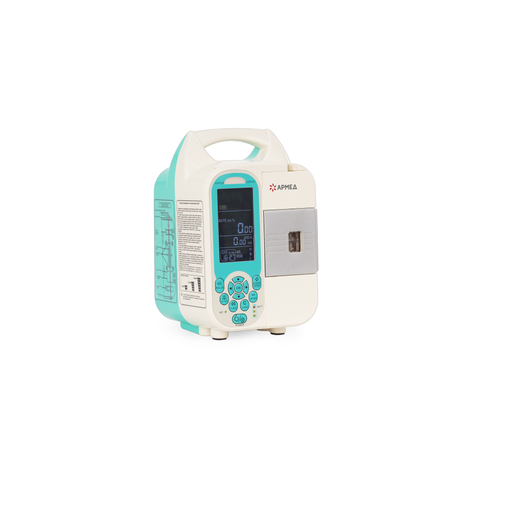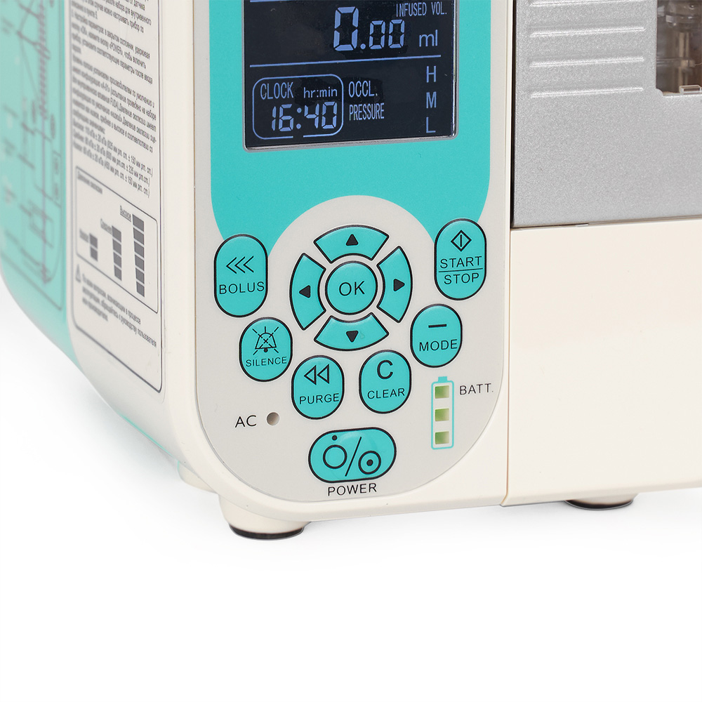 Панель управления состоит из кнопок с высоким уровнем чувствительности и понятным обозначением. Настраивать прибор получается очень быстро. Скорость и объем подачи лекарства настраиваются вручную или автоматически в зависимости от веса пациента и необходимого времени введения препарата.