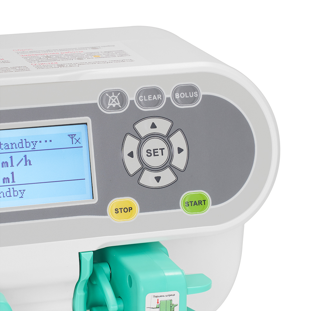 Отличительная особенность данной модели заключается в том, что можно использовать широкий диапазон шприцов. Для подключения к дозатору подходят шприцы с объемом от 5 до 60 мл. Установка шприца занимает несколько секунд.