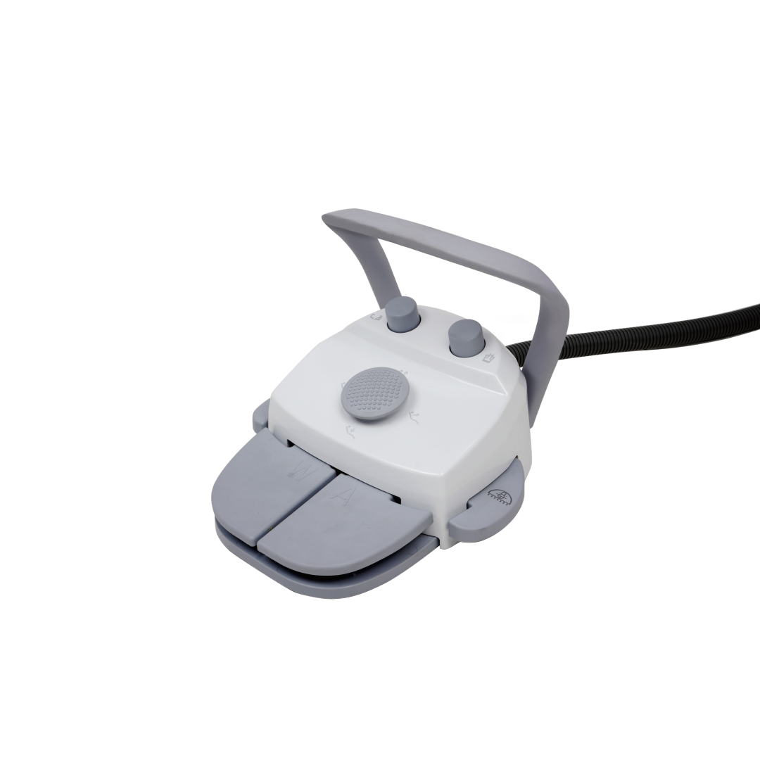 Педаль управляет подачей воды и воздуха, режимом работы наконечников, регулирует положение кресла, включает светильник, подачу воды в стакан и ополаскивание плевательницы.