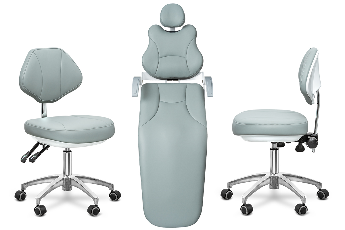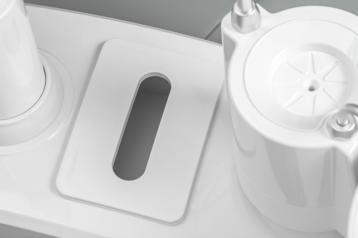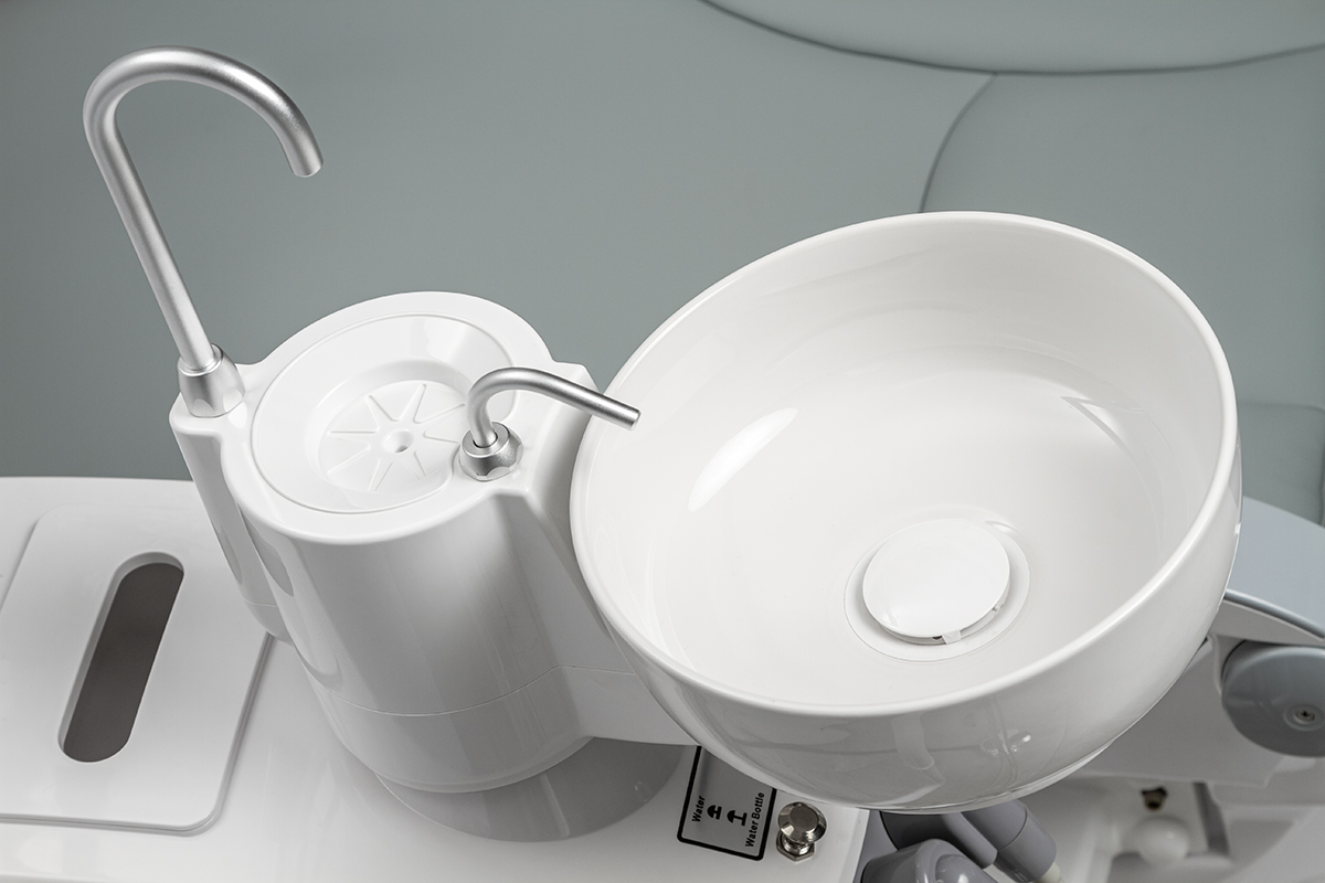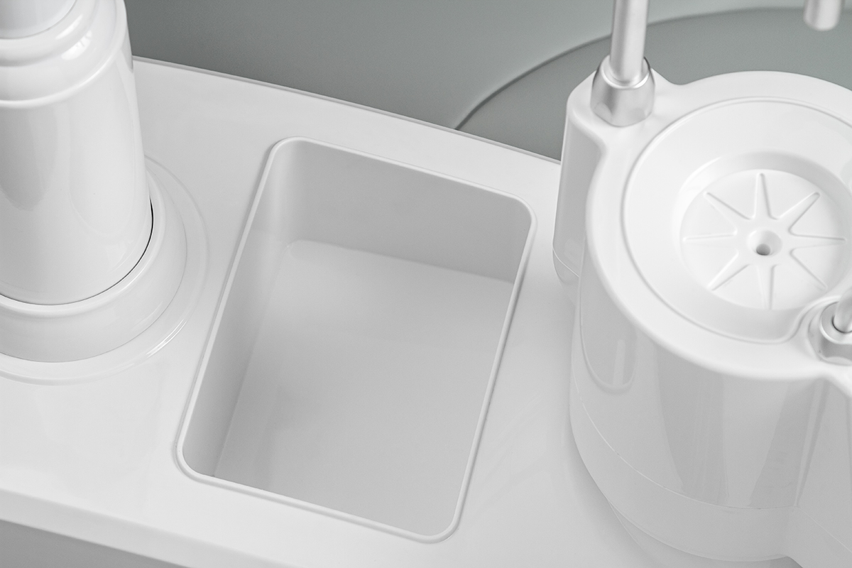 Модуль ассистента рассчитан на четыре инструмента, в базовой комплектации оснащен пылесосом и слюноотсосом. В эжекторный гидроблок встроена емкость для дистиллированной воды, которая подается под давлением. Плевательница поворотная, угол 70 градусов, частично выполнена из фарфора , есть функция автоматического обмывания чаши и наполнения стакана.