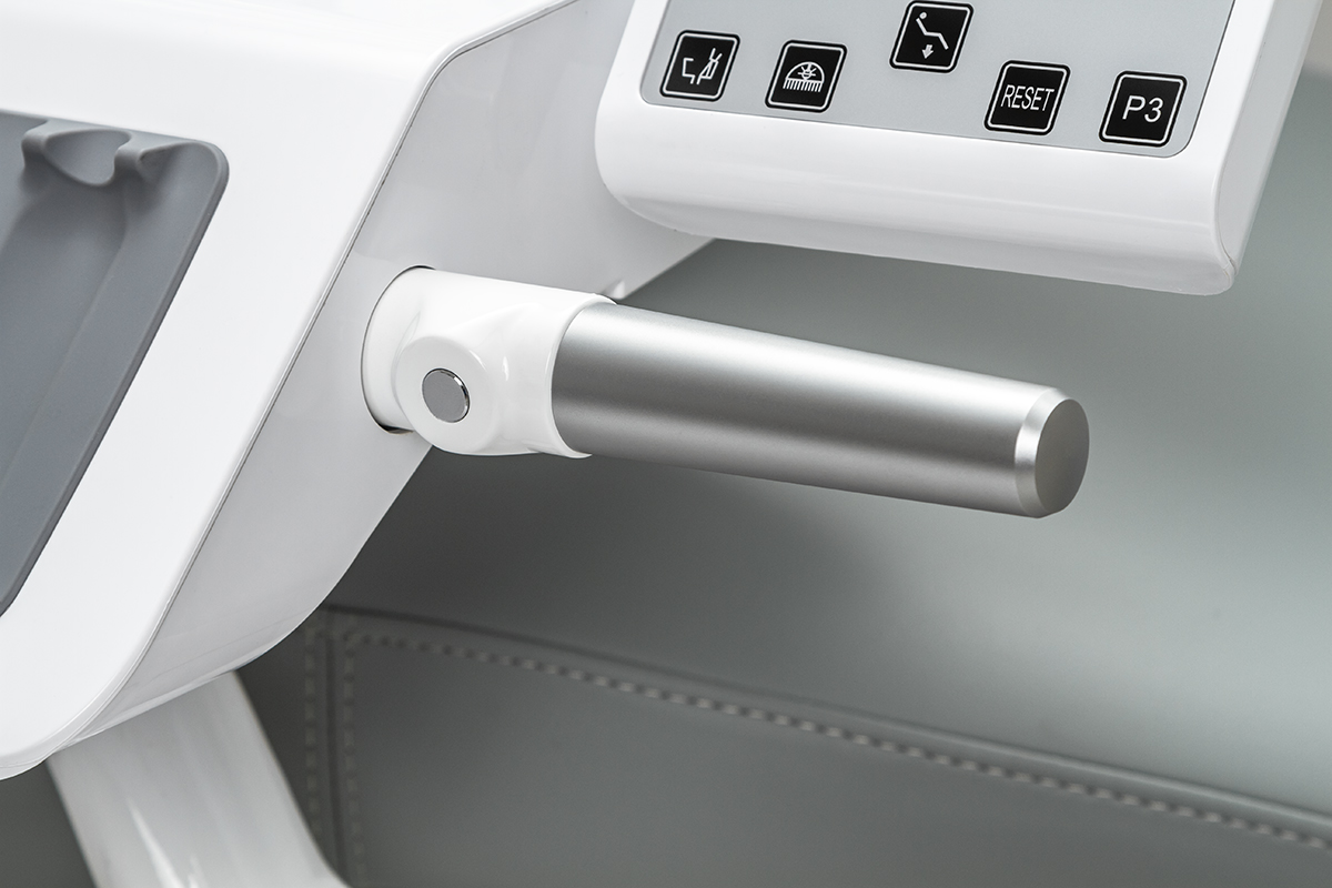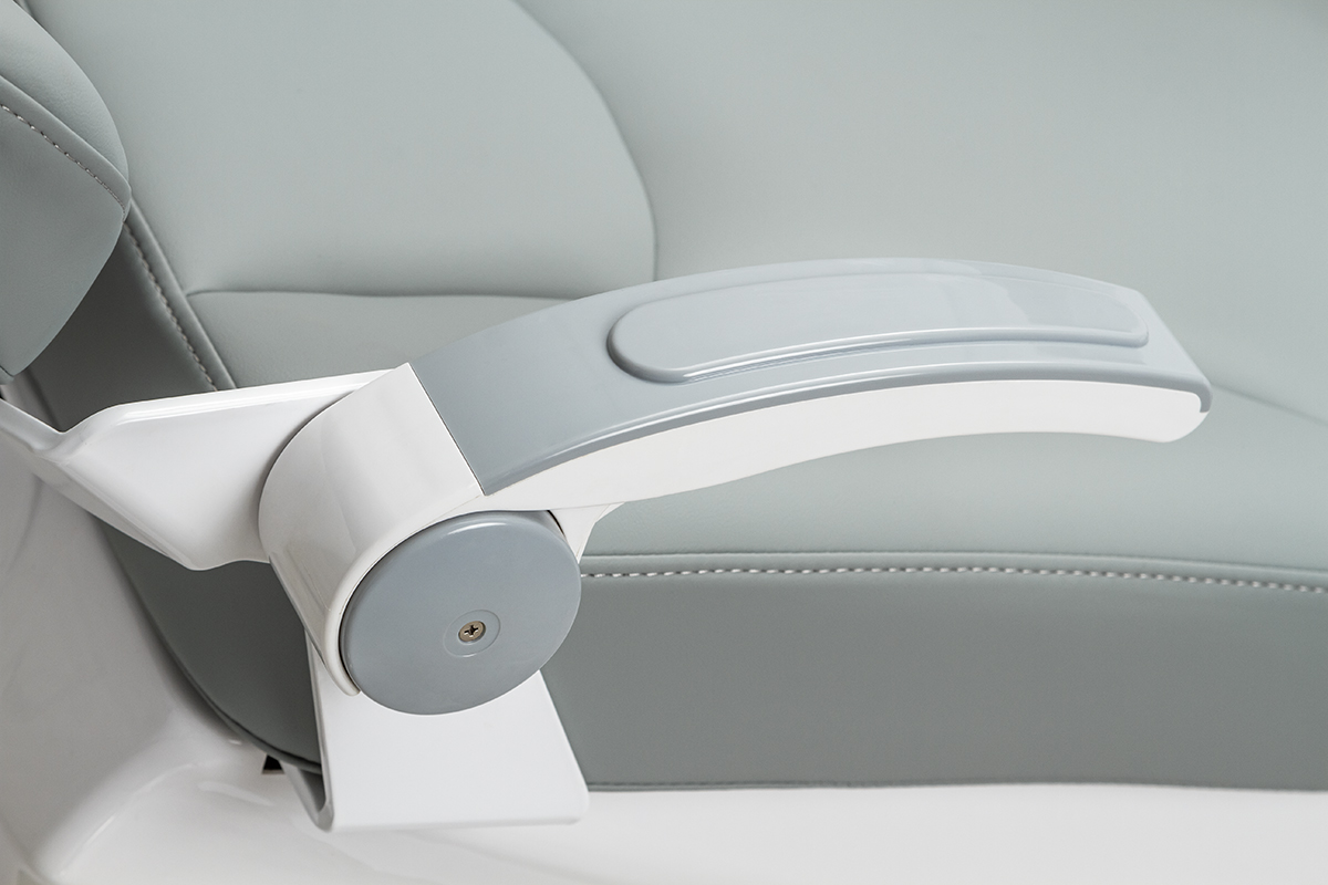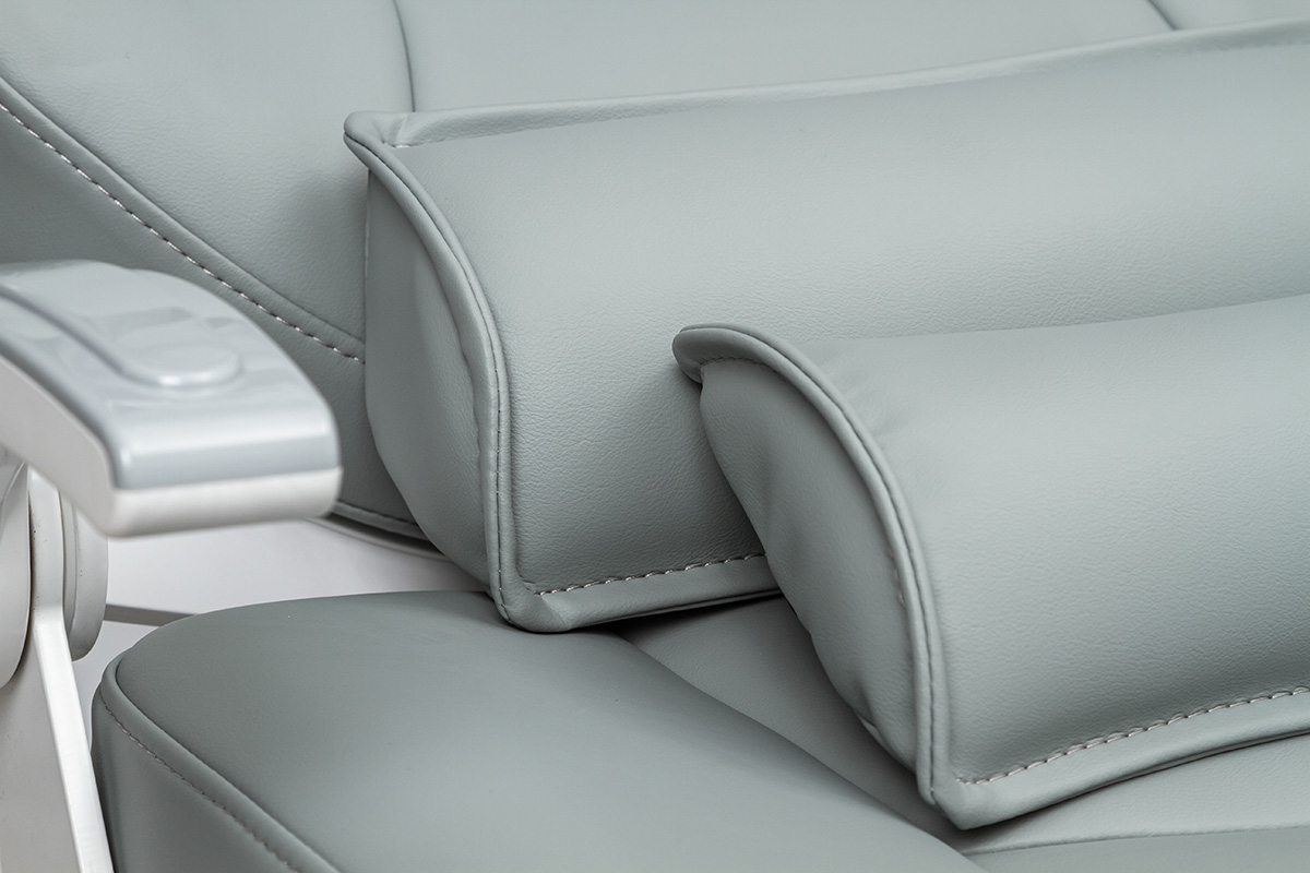 Электромеханическое кресло оснащено бесшумным двигателем мощностью 24в для регулировки сиденья и спинки, имеет износостойкую кожаную обивку. Педаль управления размещена на основании кресла: имеется возможность запрограммировать 3 положения, есть автовозврат в нижнее положение. Подголовник кресла регулируется по 3 осям, при необходимости, можно установить положение для детского приема. У данной модели два подлокотника.