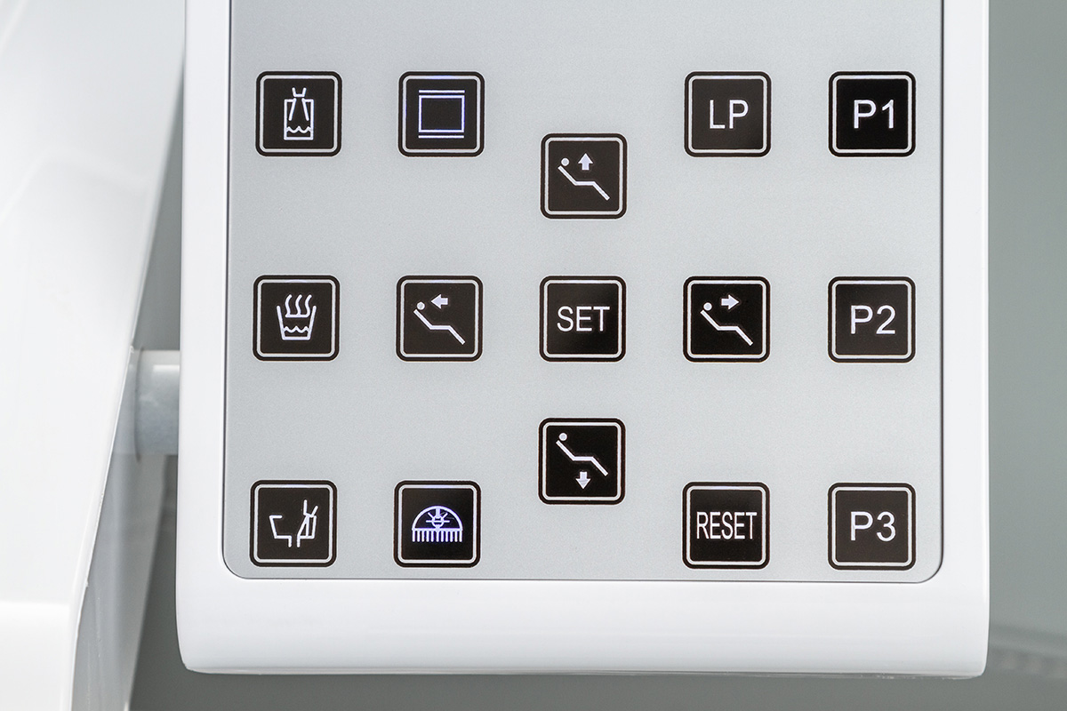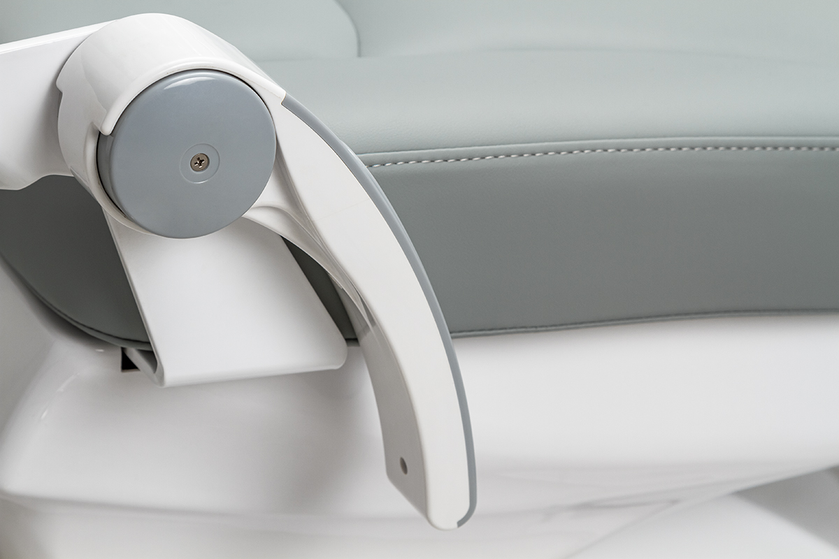 Педаль управления размещена на основании кресла: имеется возможность запрограммировать 3 положения, есть автовозврат в нижнее положение. Подголовник кресла регулируется по 3 осям, при необходимости, можно установить положение для детского приема. У данной модели один подлокотник, левый.