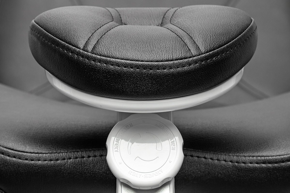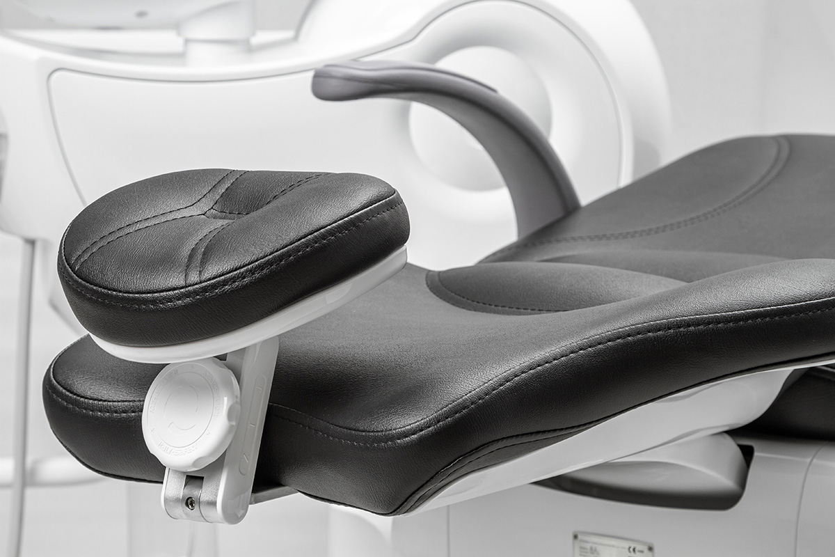 Современное кресло пациента, шовная обивка из импортной фиброкожи, широкая спинка с металлическим антивандальным основанием.