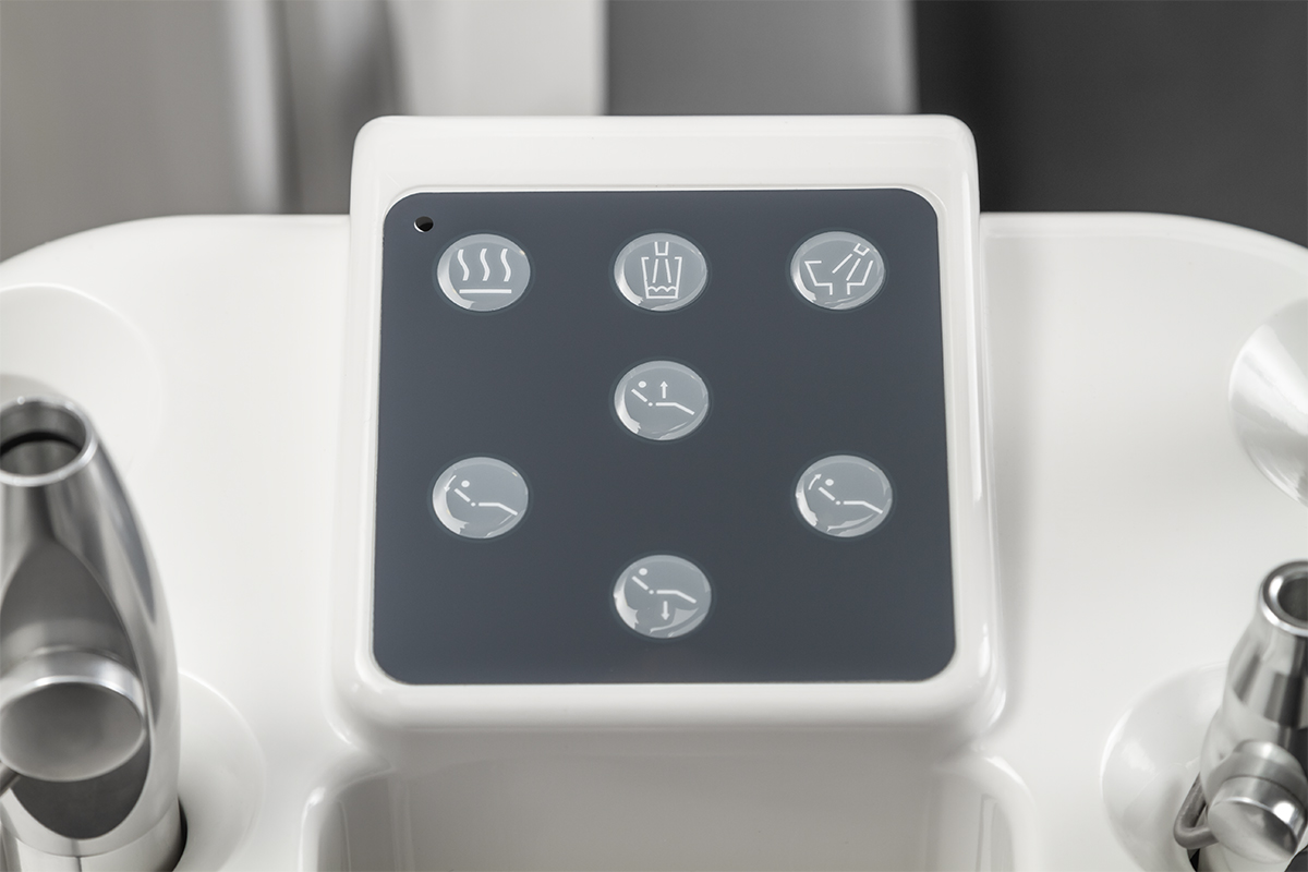 Многие стоматологи выбирают именно нижнюю подачу потому, что так пациент не видит инструментов и не испытывает напряжения. Кроме того, модуль располагается довольно низко и за инструментами не нужно далеко тянуться. Модуль врача рассчитан на 6 инструментов, он имеет пульт управления креслом.